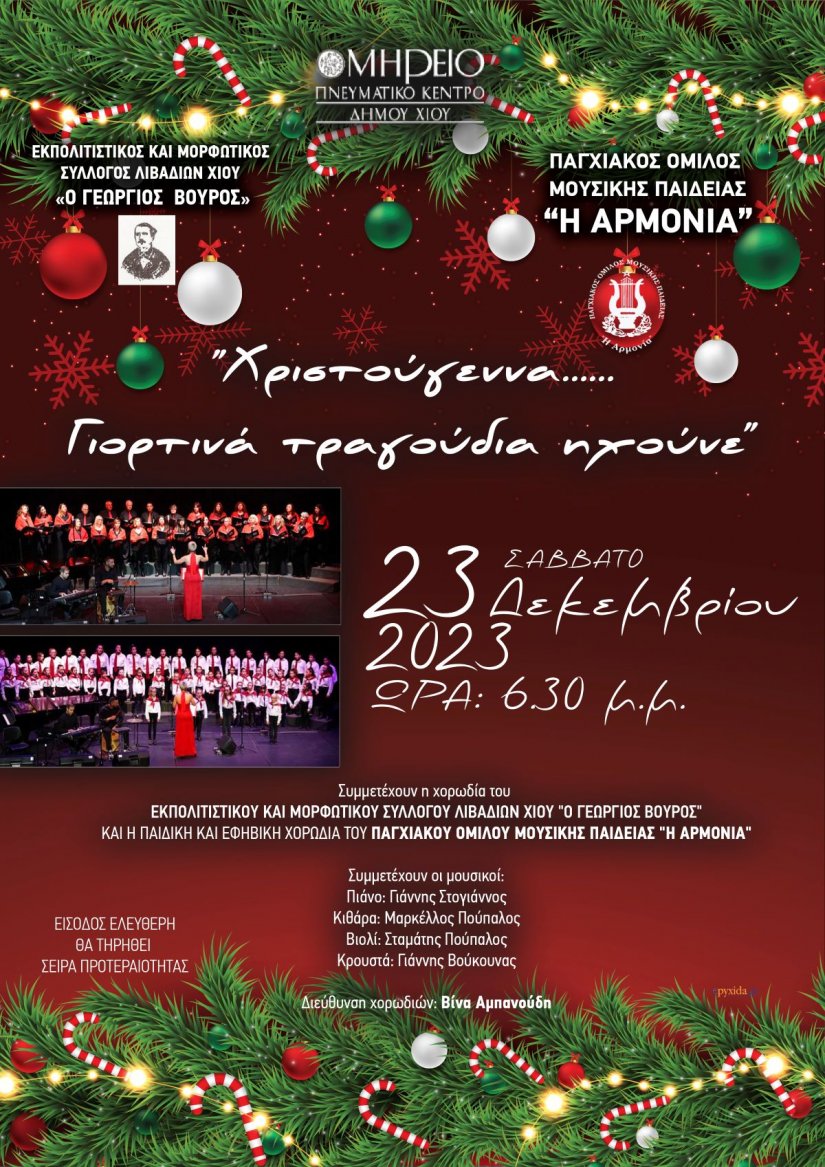 ΠολιτισμόςΤρί, 19/12/2023 - 06:22 Χριστουγεννιάτικη συναυλία διοργανώνουν στο Ομήρειο ο Βούρος Λιβαδίων και η Αρμονία, το Σάββατο 23 Δεκεμβρίου στις 6.30 μ.μ. στο Ομήρειο. Τις Χορωδίες τους διευθύνει η Βίνα Αμπανούδη.