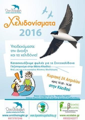 Σας περιμένουμε μικρούς - μεγάλους την Κυριακή 24 Απριλίου 2016 από τις 10.30 έως τις 14.30 στην Κλειδού, για να υποδεχθούμε την άνοιξη και τα χελιδόνια!!!