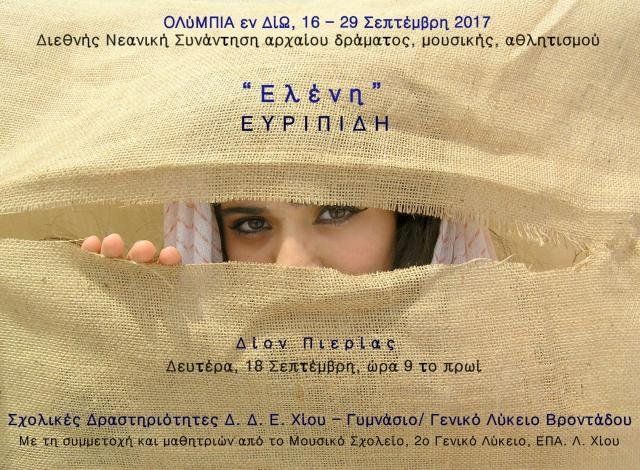 Μια ωραία Ελένη από …τη Χίο θα ταξιδέψει με τη συμ-μαθητική ομάδα της στο Δίον της Πιερίας για να θυμίσει -στο πλαίσιο της Διεθνούς Νεανικής Συνάντησης «ΟΛύΜΠΙΑ εν ΔίΩ» και, κατόπιν επιλογής- ότι όλοι οι πόλεμοι, όλες οι σφαγές, ανέκαθεν και μέχρι τώρα, έχουν ανάγκη, πρώτα από όλα, ένα πρόσχημα ή μια αληθοφανή δικαιολογία…
