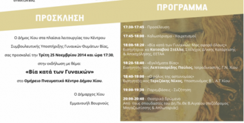 Ημερίδα για τη Βία κατά των γυναικών, με αφορμή την 25η Νοεμβρίου, Παγκόσμια ημέρα εξάλειψης της βίας κατά των γυναικών διοργανώνει την ερχόμενη Τρίτη στις 5.30 μ.μ. στο Ομήρειο το Κέντρο Συμβουλευτικής Υποστήριξης Γυναικών του Δήμου Χίου.