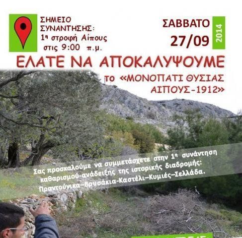 Ως πρώτη δράση έχει προγραμματίσει τον καθαρισμό-ανάδειξης του ιστορικού μονοπατιού, καλώντας όσους θέλουν να συμμετάσχουν να συναντηθούν στις 9 το πρωί του Σαββάτου στη 2η στροφή του Αίπους έχοντας μαζί τους ως απαραίτητα εφόδια: περιβολή εργασίας, κλειστά παπούτσια, γάντια, καπέλο, παγούρι με νερό, κολατσιό και προαιρετικά: κλαδευτήρι, πριόνι, αξίνα ξεχορταριάσματος, τσάπα, τσουγκράνα.
