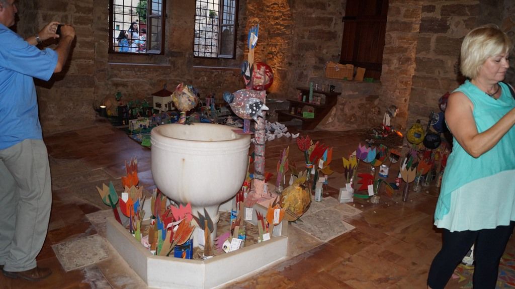Λίγο πιο κάτω το εργαστήρι του ζωγράφου, παντού κρεμασμένες μάσκες, χρώματα, σχήματα, υλικά, όλα ένα εικαστικό παιχνίδι στη λογική, πεταμένο είναι ότι πετάει το μυαλό μας.
