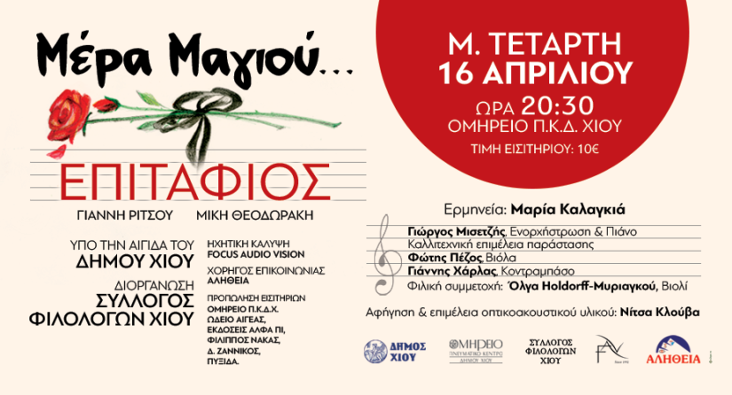Η παράσταση, η οποία διοργανώνεται από τον Σύλλογο Φιλολόγων Χίου και τελεί υπό την αιγίδα του Δήμου Χίου, έχει επίκεντρο τον Επιτάφιο, το ποιητικό έργο του Γιάννη Ρίτσου ντυμένο με την μουσική του Μίκη Θεοδωράκη, ένα έργο - σύμβολο του ελληνικού πολιτισμού, που εμπλουτισμένο με τραγούδια, βυζαντινούς ύμνους, κλασικές και λαϊκές συνθέσεις αναβιώνει τον διαχρονικό θρήνο της Μάννας, το Θείο Πάθος και τη μυσταγωγία της Μεγάλης Εβδομάδας.
