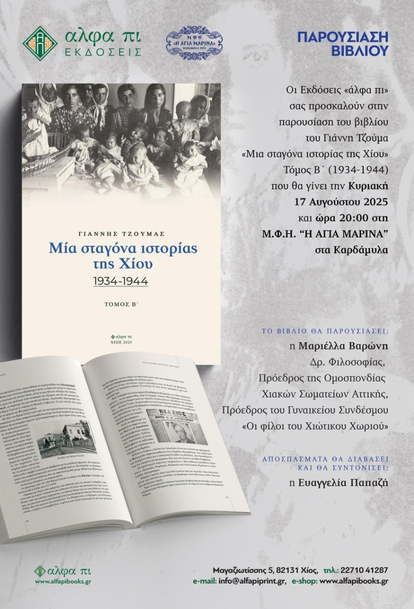 Παρουσίαση του Β' τόμου του βιβλίου του Γιάννη Τζούμα "Μια σταγόνα ιστορίας της Χίου 1934-1944" θα γίνει την Κυριακή 17 Αυγούστου στις 8.00 μ.μ. στο Γηροκομείο Καρδαμύλων, από την Δρ. Φιλολογίας, Πρόεδρο της Χιακής Ομοσπονδίας Αττικής και του Συνδέσμου Φίλοι του Χιώτικου χωριού Μαριέλλα Βαρώνη.
