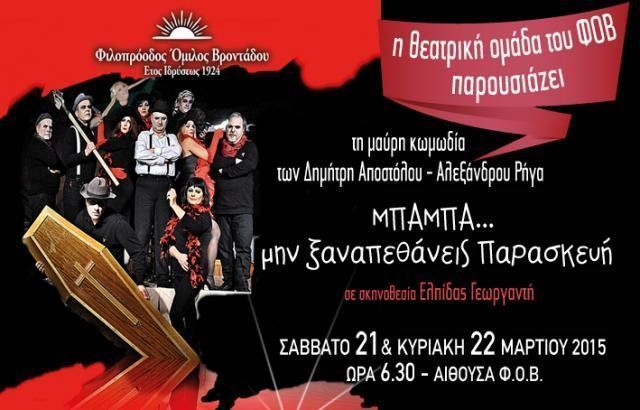 Ο Φιλοπρόοδος Όμιλος Βροντάδου προσκαλεί στις εγκαταστάσεις του το Σάββατο 21 Μαρτίου και την Κυριακή 22 Μαρτίου 2015 και ώρα 6.30 μ.μ. να παρακολουθήσουμε την κωμωδία των δύο σπουδαίων θεατρικών και όχι μόνο συγγραφέων, Αλέξανδρου Ρήγα και Δημήτρη Αποστόλου, «Μπαμπά... μην ξαναπεθάνεις Παρασκευή», που ανεβάζει η θεατρική ομάδα του Φ.Ο.Β. Τους ρόλους ερμηνεύουν οι: Κώστας Βούκουνας, Δημήτριος Αρμενάκης, Μαίρη Νύκτα-Ψυχιά, Γιάννης Κουγιούλης, Σταυρούλα Βασιλάκη-Τσαμπαρλή, Αγγελική Καστάνου-Τζούμα, Κοσμάς Αντωνιάδης, Μάρκος Κάβουρας, Δέσποινα Ζουμή, Τζένη Καλλίτση-Βούκουνα και Κώστας Τζούμας.