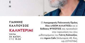 Ένας από τους πιό αξιόλογους και πολυδιαβασμένους συγγραφείς της χώρας μας, ο Γιάννης Καλπούζος θα παρουσιάσει το νέο του βιβλίο "Καλντερίμι" των εκδόσεων Ψυχογιός την Τρίτη 30 Μαϊου στις 7.30 μ.μ. στο Agora cafe στην Απλωταριά.