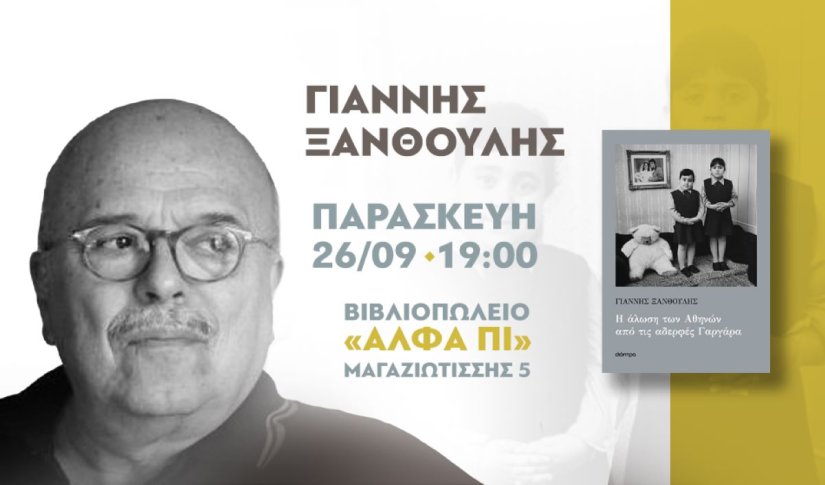 Οι εκδόσεις «διόπτρα» και οι εκδόσεις - βιβλιοπωλείο «άλφα πι» προσκαλούν την Παρασκευή 26 Σεπτεμβρίου 2025 στις 7.00 μ.μ. στον πεζόδρομο του βιβλιοπωλείου «άλφα πι», Μαγαζιωτίσσης 5, για μια εκδήλωση - συζήτηση με τον μοναδικό συγγραφέα, Γιάννη Ξανθούλη, με αφορμή το νέο του βιβλίο «Η άλωση των Αθηνών από τις αδερφές Γαργάρα».