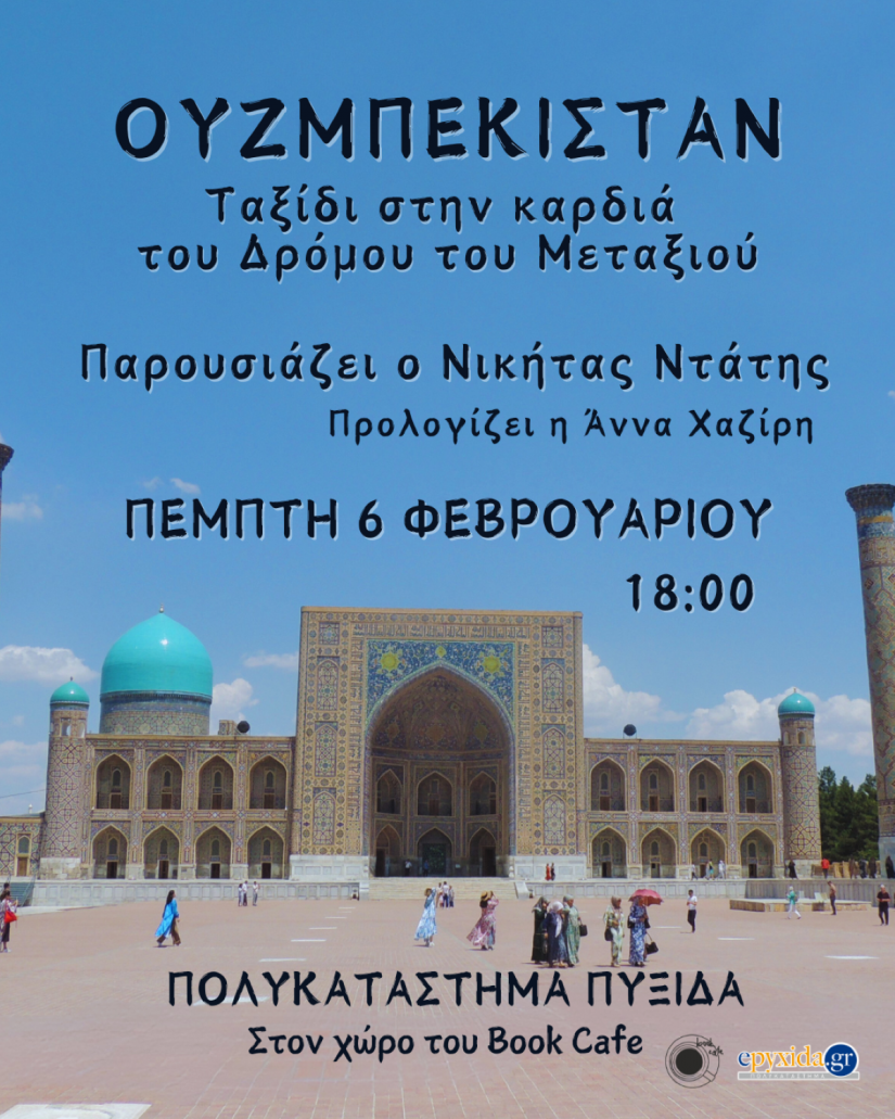 Ο Νικήτας Ντάτης, θέλοντας να αναδείξει την μοναδικότητα ενός τόπου που επισκέφτηκε ως ταξιδιώτης θα παρουσιάσει μια συναρπαστική χώρα της Κεντρικής Ασίας με τη σπουδαία ιστορική κληρονομιά και τα μοναδικά αξιοθέατα, την Πέμπτη 6 Φεβρουαρίου 2025, στις 6:00 μ.μ. στο Book Cafe του Πολυκαταστήματος ΠΥΞΙΔΑ.
