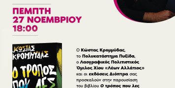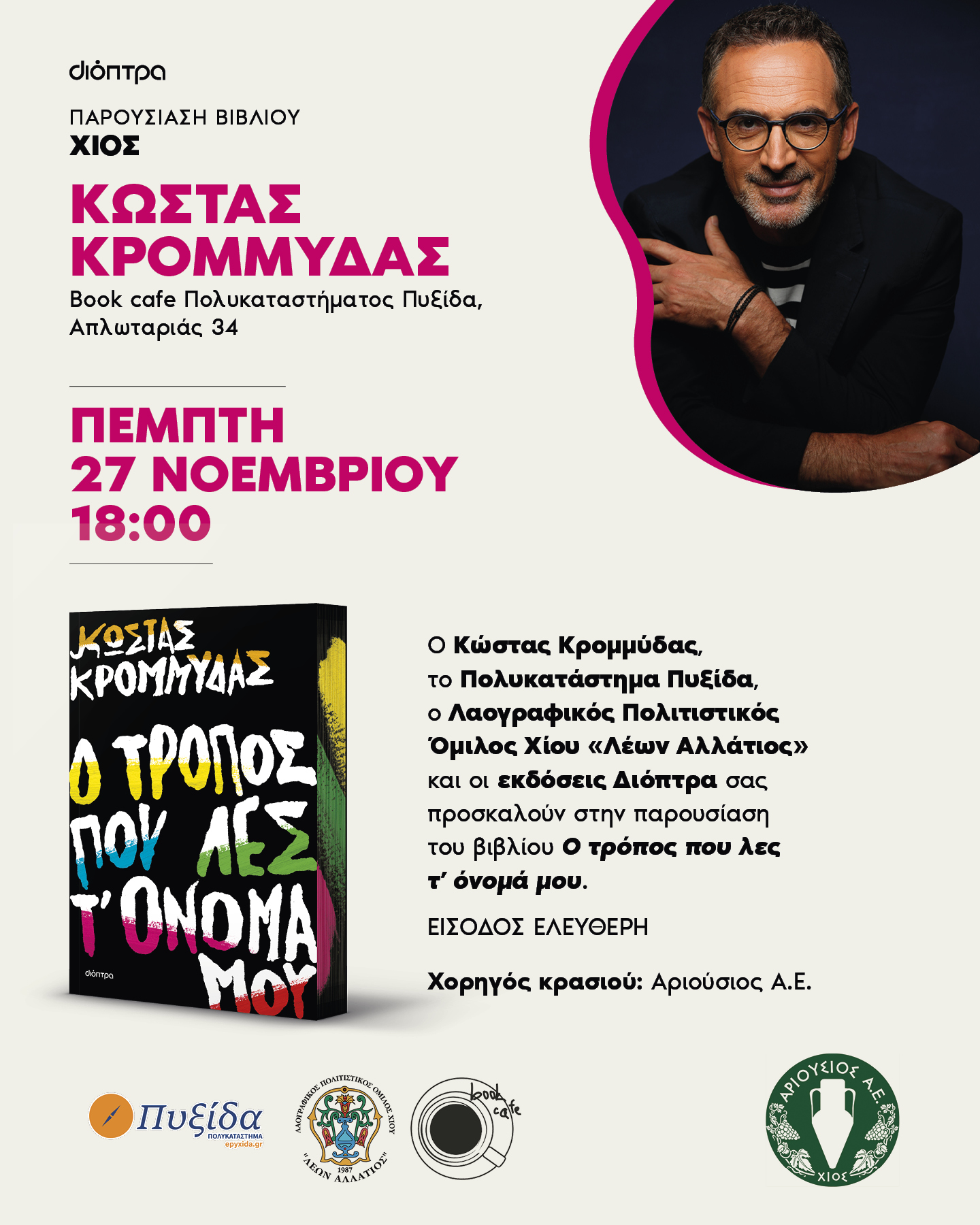 Το Πολυκατάστημα Πυξίδα, ο Λαογραφικός Πολιτιστικός Όμιλος Χίου "Λέων Αλλάτιος" και οι εκδόσεις Διόπτρα παρουσιάζουν την Πέμπτη 27 Νοεμβρίου, στις 6 μ.μ., στο  Book Cafe του Πολυκαταστήματος ΠΥΞΙΔΑ το βιβλίο του Κώστα Κρομμύδα "Ο τρόπος που λες τ' όνομά μου".