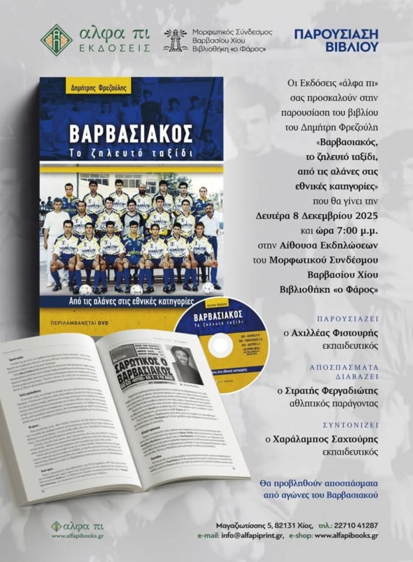 Οι εκδόσεις ΑΛΦΑ ΠΙ και ο Μορφωτικός Σύνδεσμος Βαρβασίου Χίου Βιβλιοθήκη «ο Φάρος» προσκαλούν στην παρουσίαση του βιβλίου του Δημήτρη Φρεζούλη: «Βαρβασιακός, το ζηλευτό ταξίδι, από τις αλάνες στις εθνικές κατηγορίες» τη Δευτέρα 8 Δεκεμβρίου 2025 στις 7:00 μ.μ .στην αίθουσα εκδηλώσεων του Φάρου Βαρβασίου. Το βιβλίο θα παρουσιάσει ο εκπαιδευτικός Αχιλλέας Φιστουρής, ενώ αποσπάσματα θα διαβάσει ο αθλητικός παράγοντας Στρατής Φεργαδιώτης. Θα συντονίσει ο εκπαιδευτικός Χαράλαμπος Σαχτούρης.