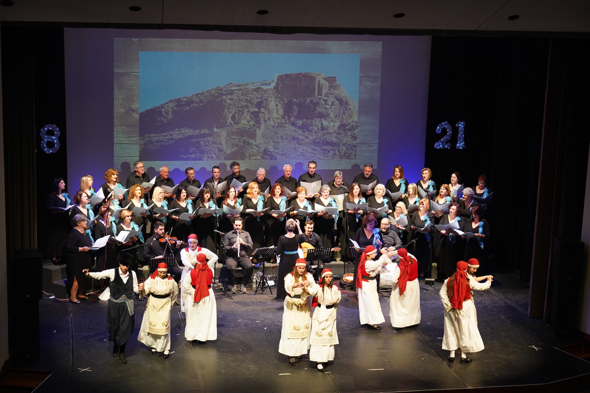 Στην παράσταση ο κόσμος είχε την ευκαιρία να απολαύσει μοναδικές στιγμές ακρόασης, από τη χορωδία του Συλλόγου, που απαρτιζόμενη από έμπειρα μέλη, ενήλικων ανδρών και γυναικών, τραγούδησε με την σειρά της παραδοσιακά άσματα της ελληνικής επανάστασης του ’21.