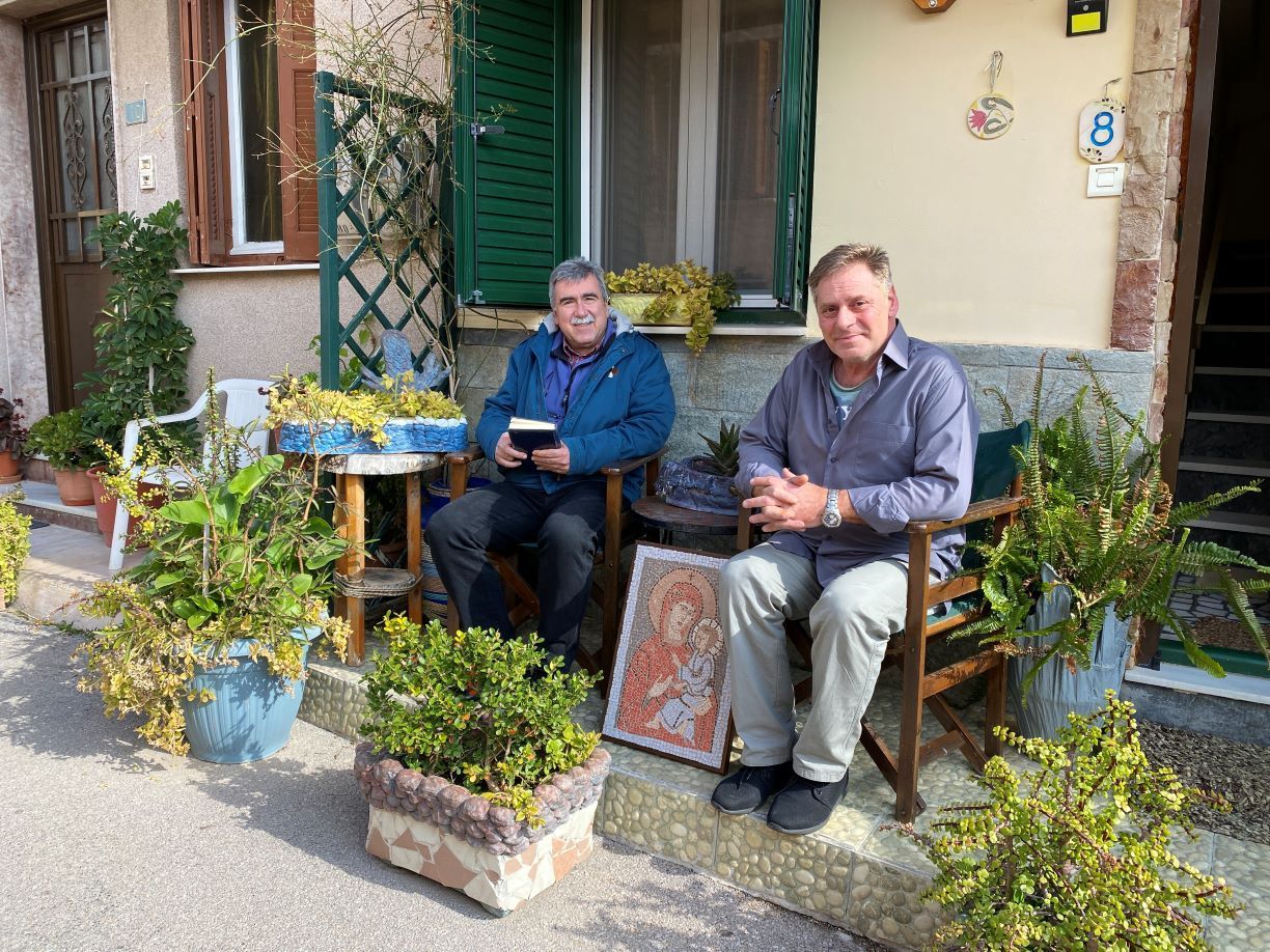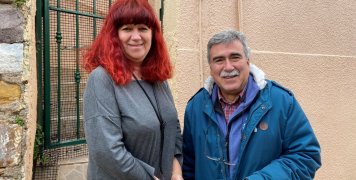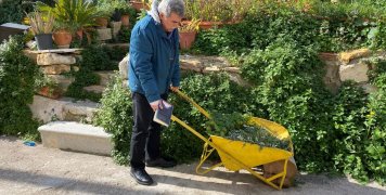 Μορφή τέχνης έχει δώσει και στις δικές ζαρντινιέρες η Κική Γεωργούλη, όπως εξηγεί και ο επίσης μουσικός σύζυγος της Αλέκος, που τις καλλιτεχνικές του ανησυχίες τις διοχετεύει και στην κατασκευή ψηφιδωτών από... σπασμένα πλακάκια.