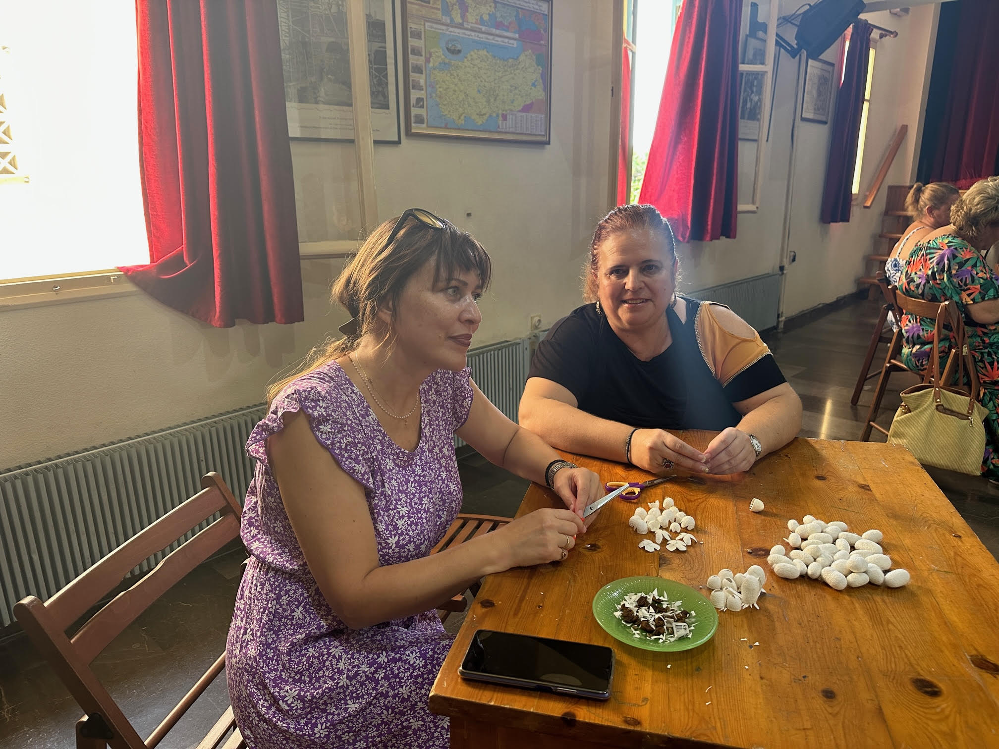 Στο δημιουργικό εργαστήρι, μέλη των σωματείων, ξεχώρισαν και επεξεργάστηκαν τα κουκούλια από τους μεταξοσκώληκες στην προσπάθεια να αναβιώσουν το ελληνικό έθιμο που είχαν οι πρόγονοι τους.