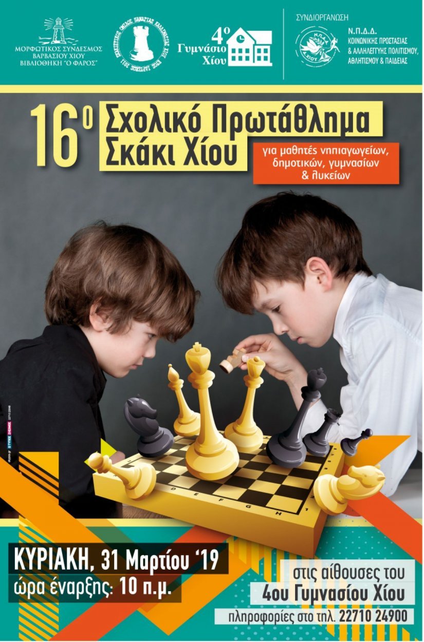 Την Κυριακή 31 Μαρτίου 2019 στις 10:00 π.μ., στις αίθουσες του 4ου Γυμνασίου Χίου θα διεξαχθεί το 16ο Σχολικό Πρωτάθλημα Σκάκι Χίου, για μαθητές και μαθήτριες των Νηπιαγωγείων, Δημοτικών, Γυμνασίων και Λυκείων.
