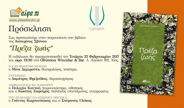 Tο πρώτο βιβλίο της Κατερίνας Σβήνου από τις εκδόσεις Άλφα Πι με τίτλο «Πρέζα Ζωής» θα παρουσιαστεί την Τετάρτη 22 Φεβρουαρίου στις 19:30 στην Οδύσσεια.