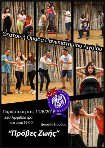 Η Θεατρική Ομάδα του Πανεπιστημίου Αιγαίου στη Χίο, γέννημα της ανάγκης για καλλιτεχνική έκφραση, αναζήτηση και προβληματισμό θα επιχειρήσει την παρθενική της έκθεση στο κοινό της το Σάββατο 11 Ιουνίου. Ώρα τοκετού 19:00 και χώρος το Αμφιθέατρο «Ι. Καράλης» (είσοδος από οδό Μουσείου).