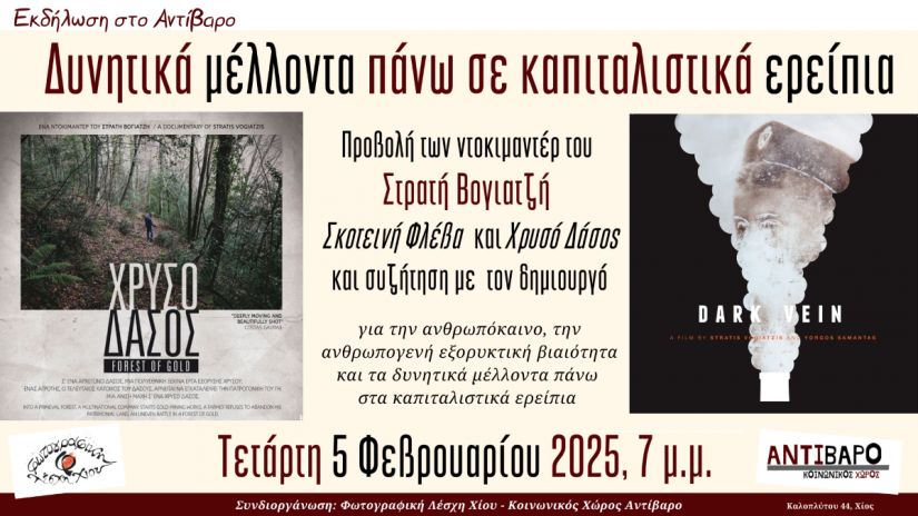 Τα δυο ντοκιμαντέρ του Στρατή Βογιατζή, «Σκοτεινή Φλέβα» και «Χρυσό Δάσος», που μας ταξιδεύουν στα Βαλκάνια και στις Σκουριές της Χαλκιδικής, θα αποτελέσουν την αφορμή για την πρωτότυπη εκδήλωση - συζήτηση για την ανθρωπόκαινο, την ανθρωπογενή εξορυκτική βιαιότητα και τα δυνητικά μέλλοντα πάνω στα καπιταλιστικά ερείπια, που διοργανώνει ο Κοινωνικός Χώρος Αντίβαρο και η Φωτογραφική Λέσχη Χίου την προσεχή Τετάρτη 5/2/2025. Η εκδήλωση, στον πάντα φιλόξενο χώρο του Αντίβαρου (Καλοπλύτου 44) θα ξεκινήσει στις 7 το απόγευμα.