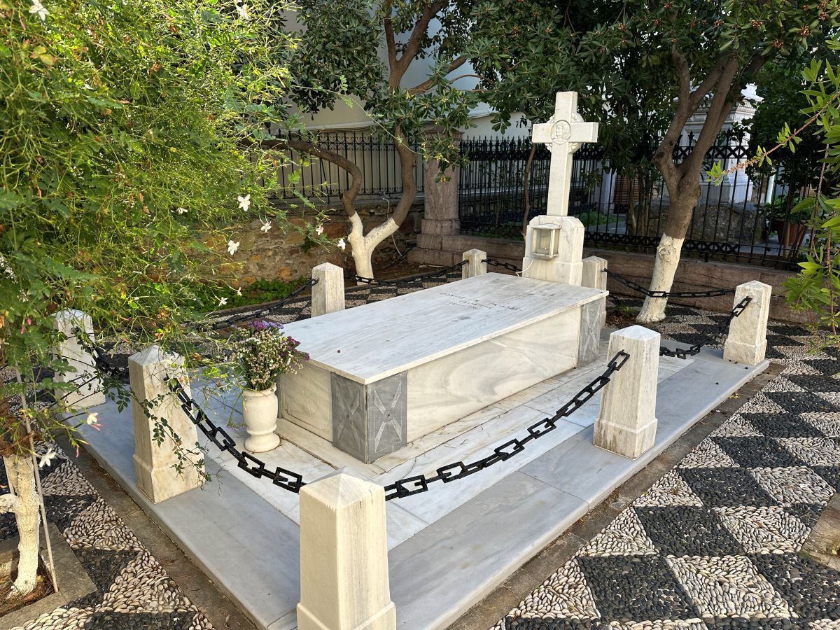 Έξω από τον Ναό βρίσκεται ομοίωμα του παλαιού, κενοτάφειο της οικογένειας Ζερβούδη καθώς και ο τάφος του Ιωάννη Γκιάλα.