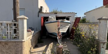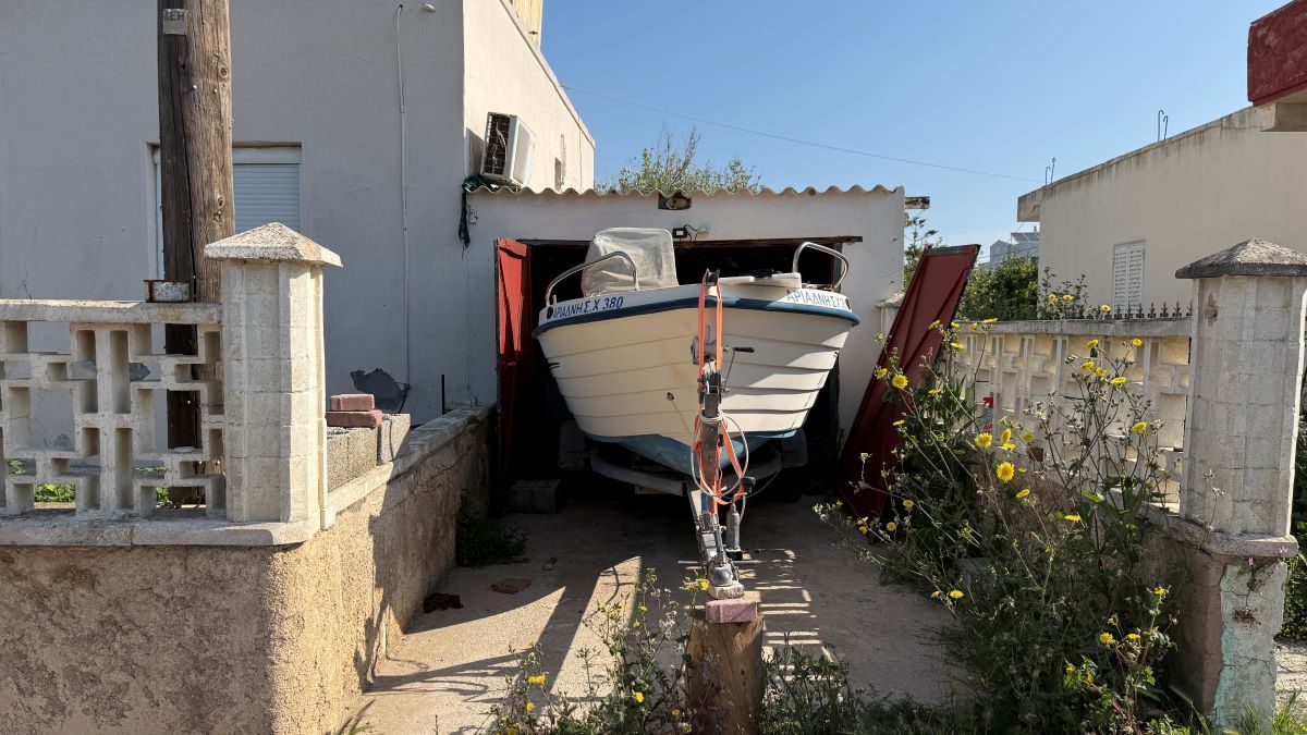 Απέναντι μας ο άσπρος τοίχος της περίφραξης ενός σπιτιού, με ένα κήπο γεμάτο από μαργαρίτες, λεμονιές και ένα σκιερό άμπελο. Μια κόκκινη πόρτα ενός γκαράζ, άλλη μια περίφραξη με τσιμεντένια τετράγωνα και ένας χώρος ανάπαυσης της βάρκας Αριάδνης, που αντί της θάλασσας βρίσκεται στην στεριά.