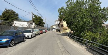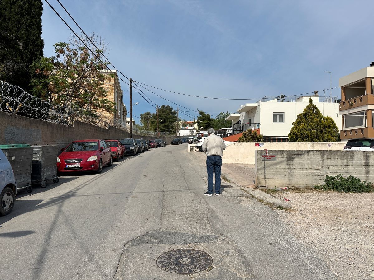 Σύγχρονες οικίες, συνάντηση με την κατηφορική οδό Ύδρας και απέναντι μας η άλλη είσοδος στις κατοικίες, αυτή τη φορά με 9 σκαλοπάτια, τριπλάσια σε αριθμό από την άλλη πλευρά τους.