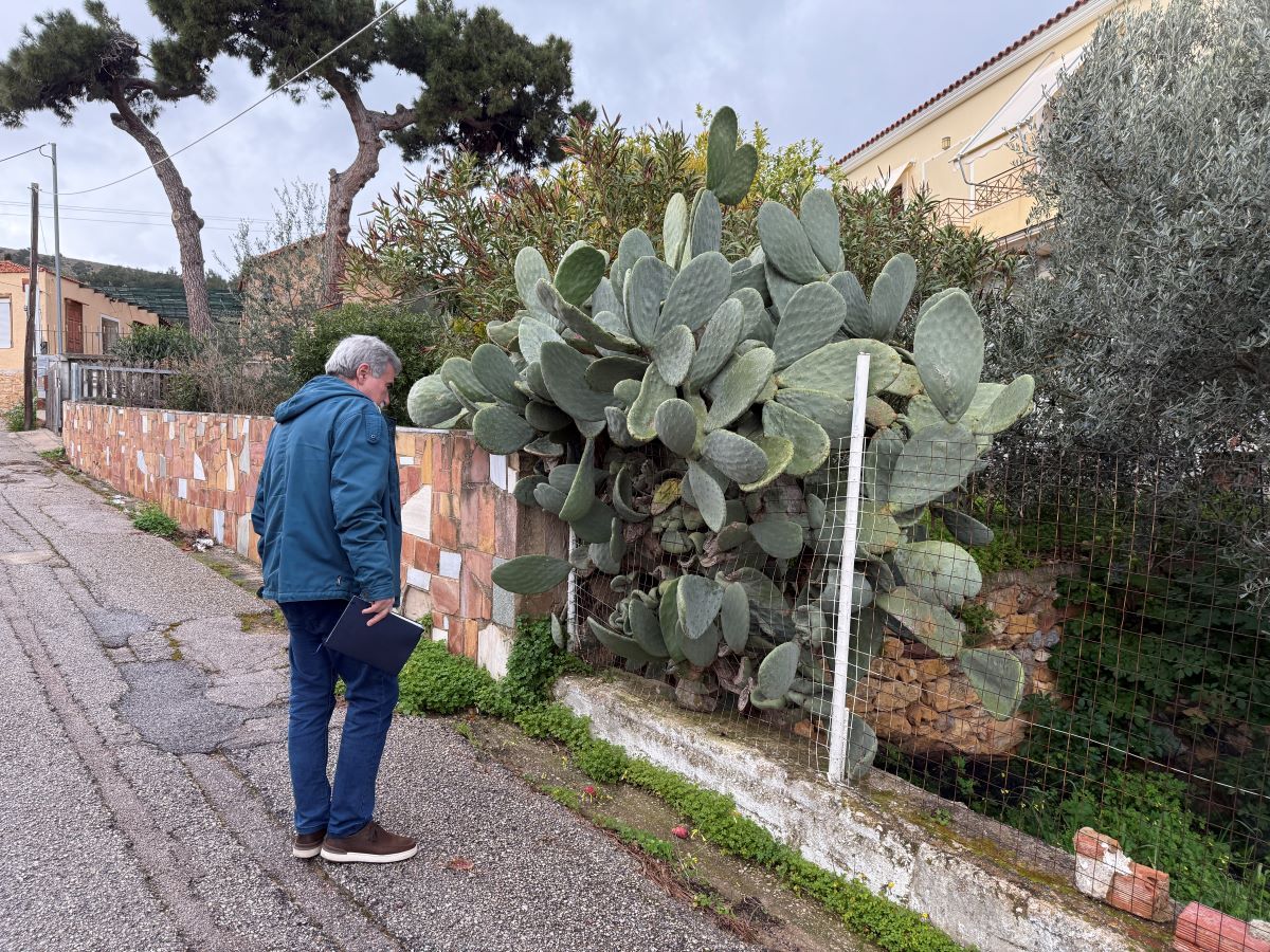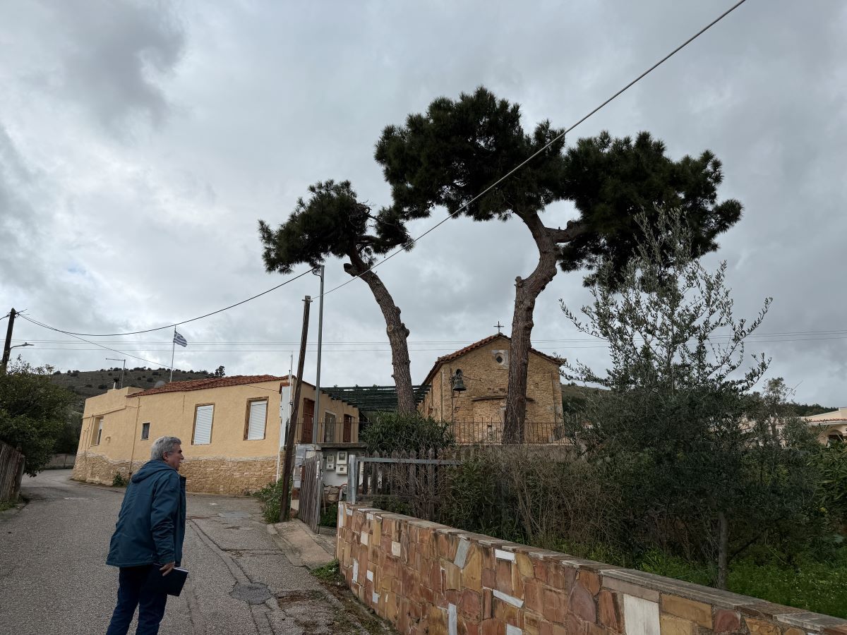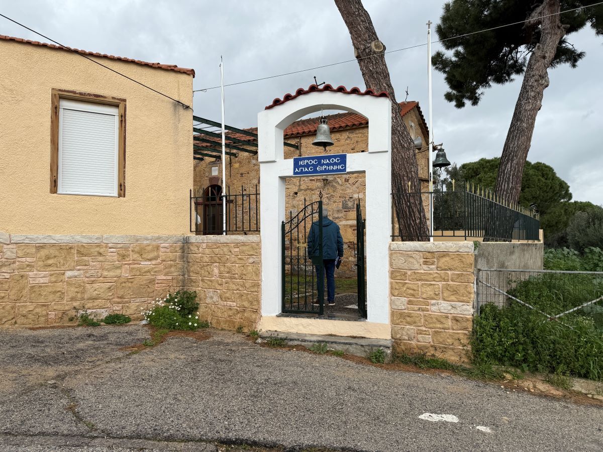 Οικοδομές υπό ανέγερση, ένας κάκτος στην γωνία, που τα φύλλα του έχουν προσαρμοστεί στα ελεύθερα σημεία των συρμάτων περίφραξης, χωράφια και από τις δύο πλευρές και στο βάθος δύο μεγάλα πεύκα, που σκιάζουν την μικρή Εκκλησία της Αγίας Ειρήνης.
