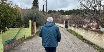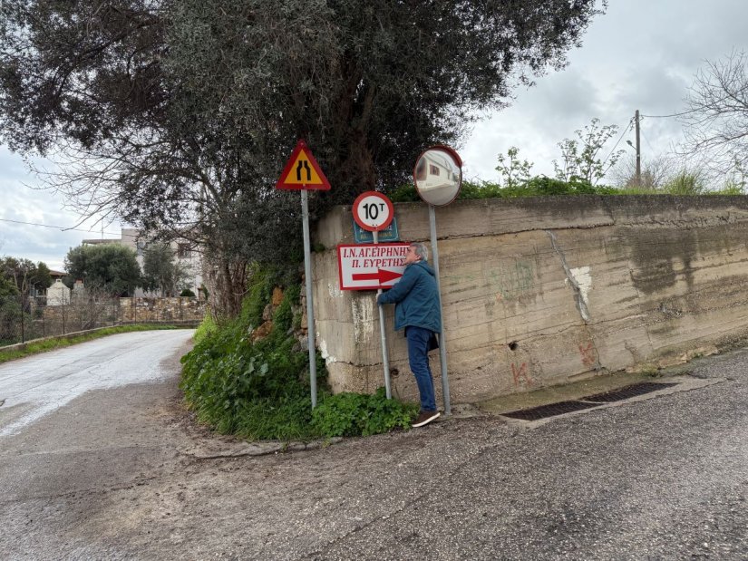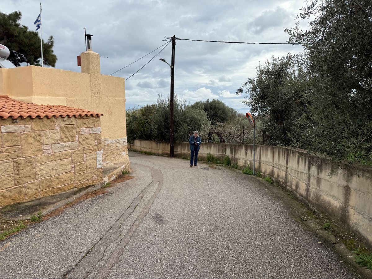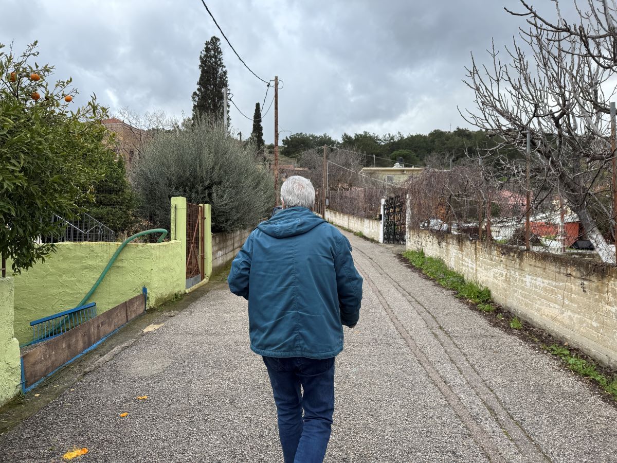 Ο δρόμος είναι ανηφορικός, με μια διώροφη οικία δεξιά και αριστερά μας χωράφια, αφού σαφώς η περιοχή είχε τουλάχιστον παλιά αγροτικό χαρακτήρα.