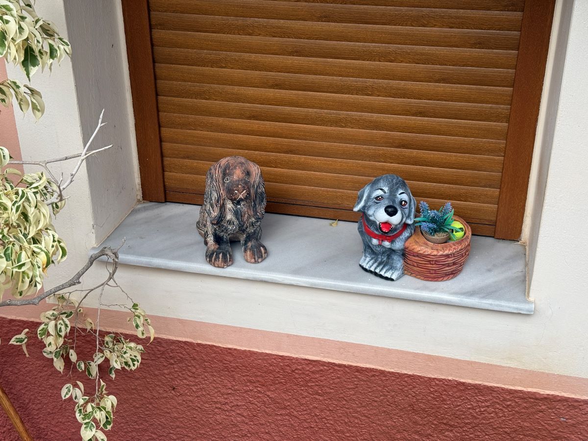 Άλλη μια οικία δεξιά μας, με δυό μινιατούρες σκυλάκια στην παραθυρόπλακα και εδώ ολοκληρώνεται η μικρή σε μήκος οδός Αγίας Ειρήνης, στην οποία από την οδό Ηρακλείτου ξεκινήσαμε την περιήγηση μας και στην διασταύρωση των οδών Παναγίας Ευρετής και Γεωργίου Παπανδρέου «Φτου και βγήκαμε».