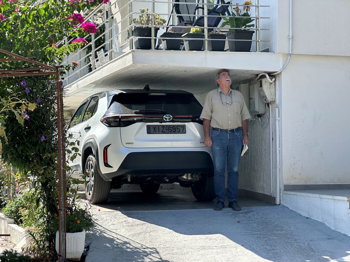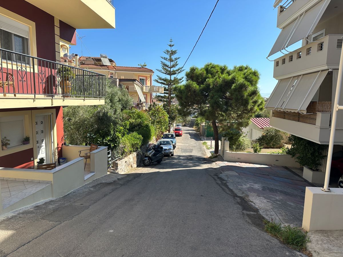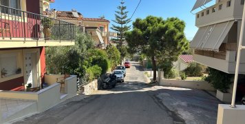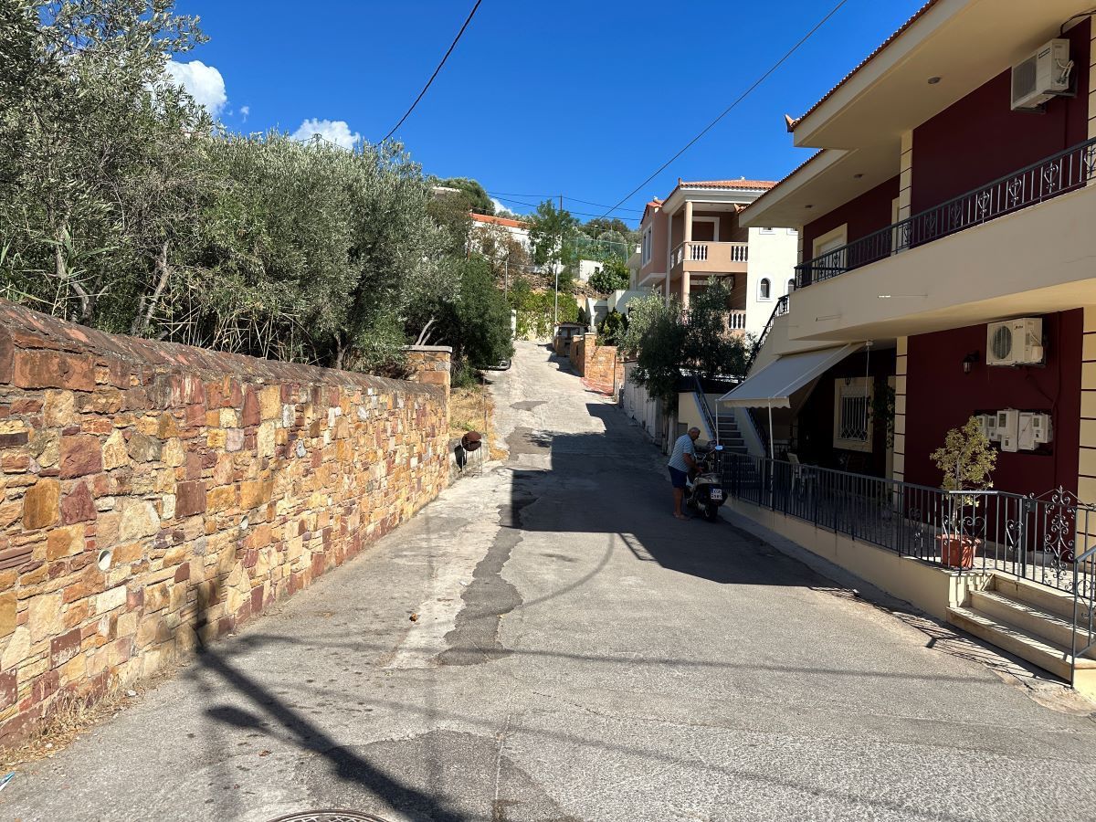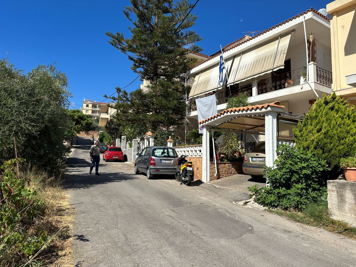 Μια σημαία πάνω από ένα γιασεμί, οικίες που συνεχίζονται στην κατηφοριά, χωράφια ακόμα και με κότες, πεύκα μικρά και τσικουδιές και ένα γκαράζ με ημερομηνία 2003 και εδώ φτάνουμε στο τελευταίο τριώροφο της οδού, που κάτω από το μπαλκόνι του φιλοξενεί ένα Ι.Χ. σε μετρημένο ύψος 1,80 περίπου.