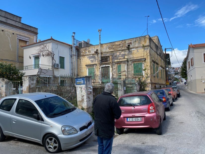 Ένα παλιό σπίτι στη γωνία, ένας κολλημένος στο Νοτιά δείκτης καιρού, μια μαρμάρινη αρχαία κολώνα, ενσωματωμένη στον τοίχο, μαρτυρά εδώ ιστορία υπό… κατάρρευση, ενώ με μια άχρωμη κατοικία απέναντι και τα πρώην γραφεία της Καθολικής Επισκοπής, οδηγεί στην δεύτερη συνάντηση της με την οδό Ιουστινιάνι, που εδώ ο γραφέας τον θέλει με η, από το… Γιάννης.