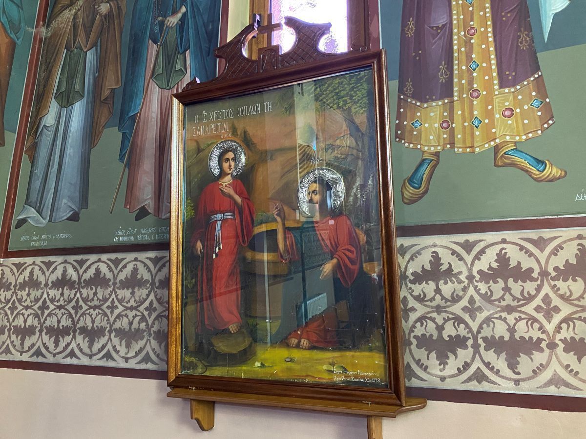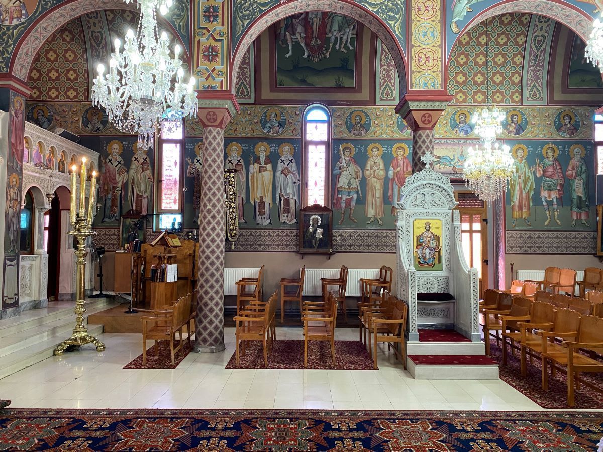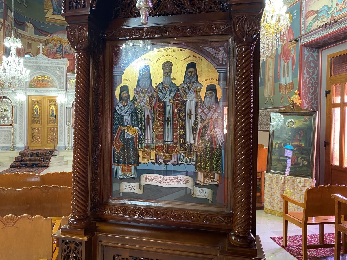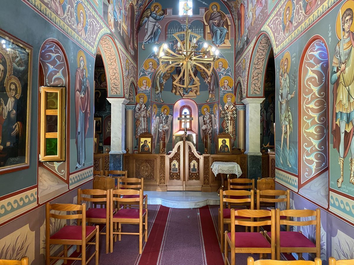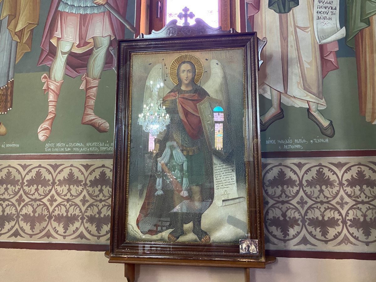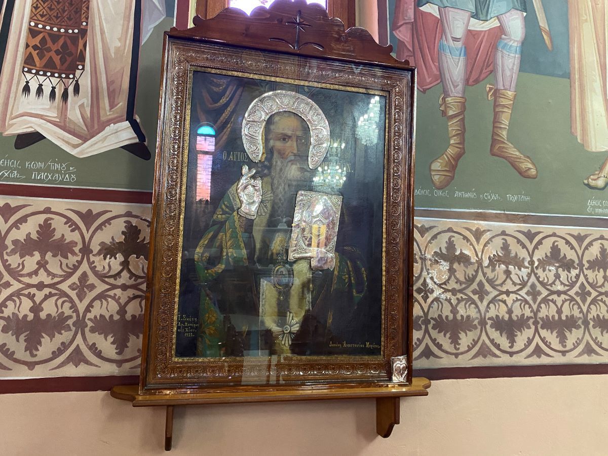 Μας υποδέχεται ο Ιερέας Νεκτάριος Επιτροπάκης, παιδί προσφύγων ο ίδιος, ιδιαίτερα προσιτός, σεβάσμιος και αρκετά κατατοπισμένος, σε μια Εκκλησιά, που μας προδιαθέτει για το ιδιαίτερο του χώρου, αφού από την μια μεριά της εισόδου της έχει την αναπαράσταση της μεταφοράς της εικόνας του Αγίου από τον Τσεσμέ στην Χίο και από την άλλη το δράμα της προσφυγιάς του 1922.