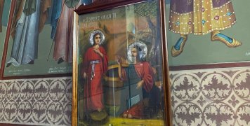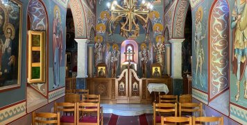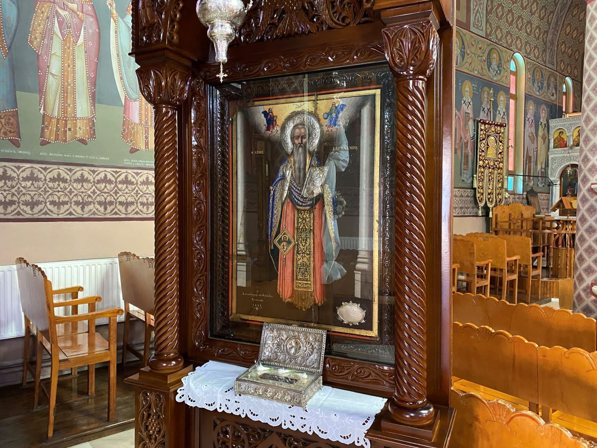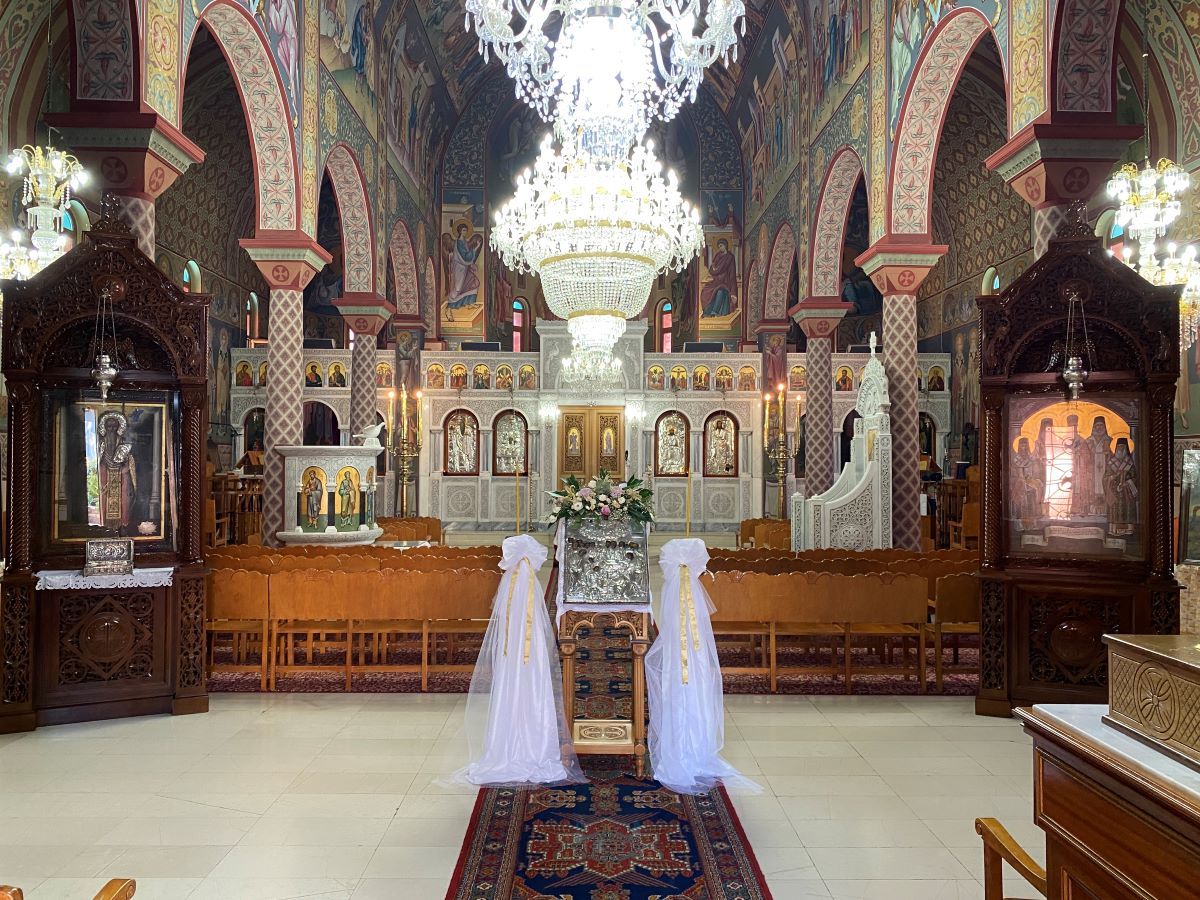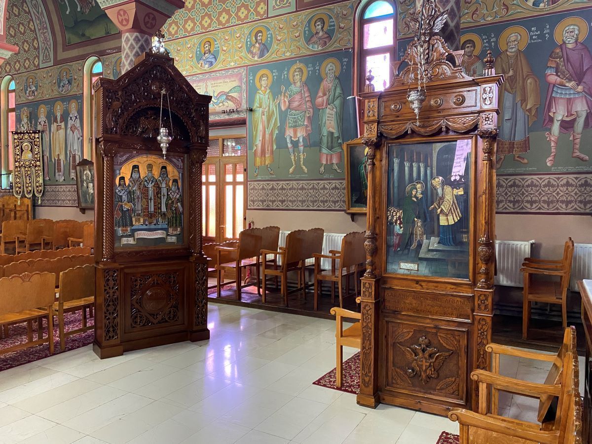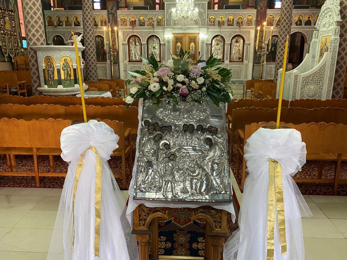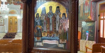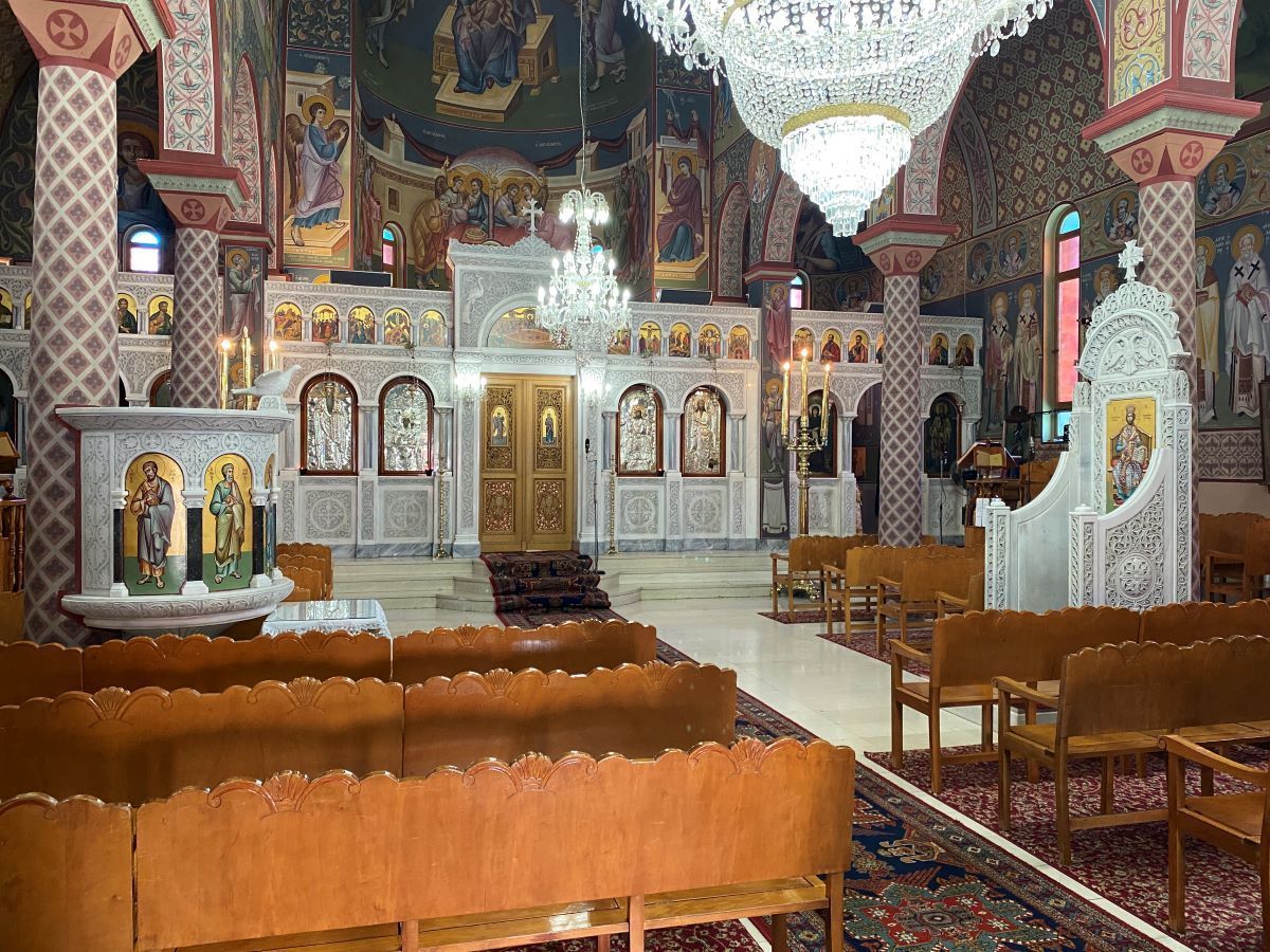 Μας υποδέχεται ο Ιερέας Νεκτάριος Επιτροπάκης, παιδί προσφύγων ο ίδιος, ιδιαίτερα προσιτός, σεβάσμιος και αρκετά κατατοπισμένος, σε μια Εκκλησιά, που μας προδιαθέτει για το ιδιαίτερο του χώρου, αφού από την μια μεριά της εισόδου της έχει την αναπαράσταση της μεταφοράς της εικόνας του Αγίου από τον Τσεσμέ στην Χίο και από την άλλη το δράμα της προσφυγιάς του 1922.