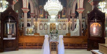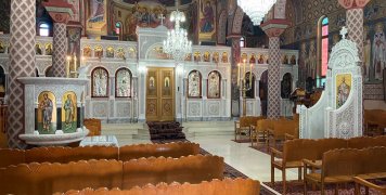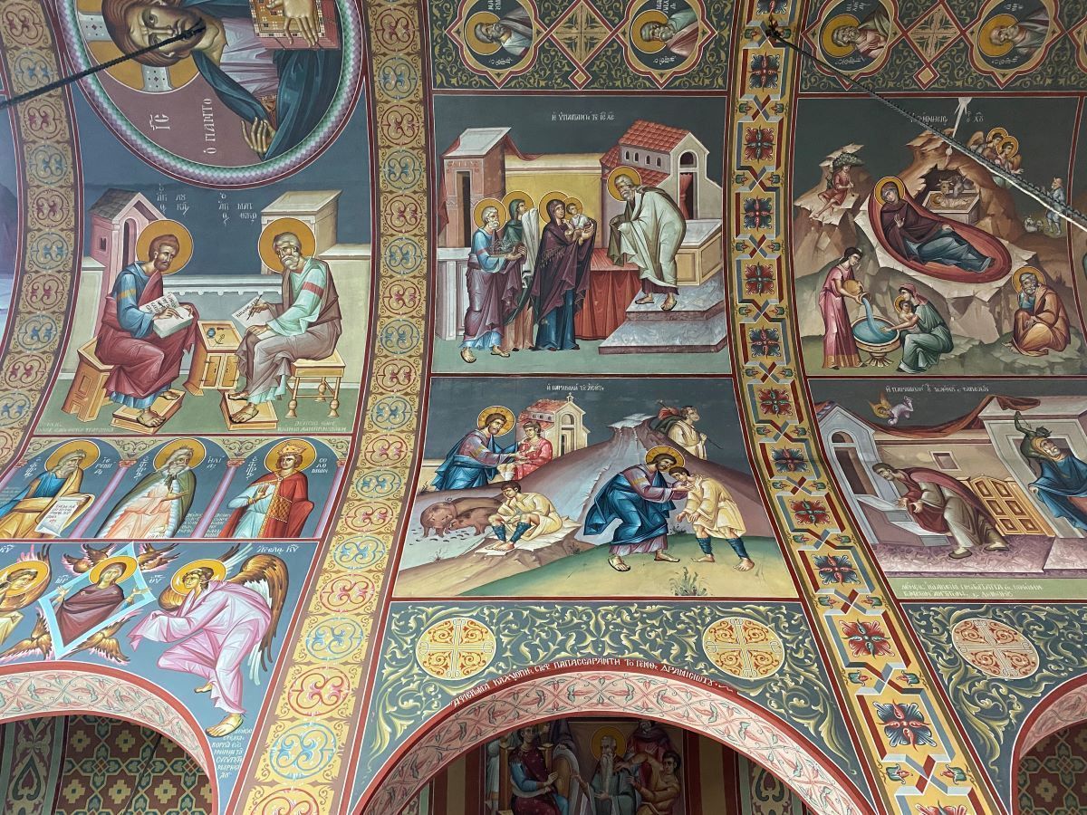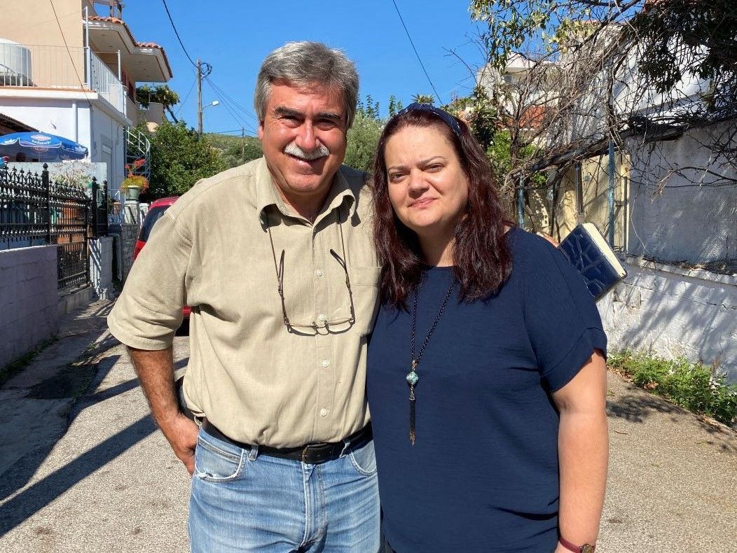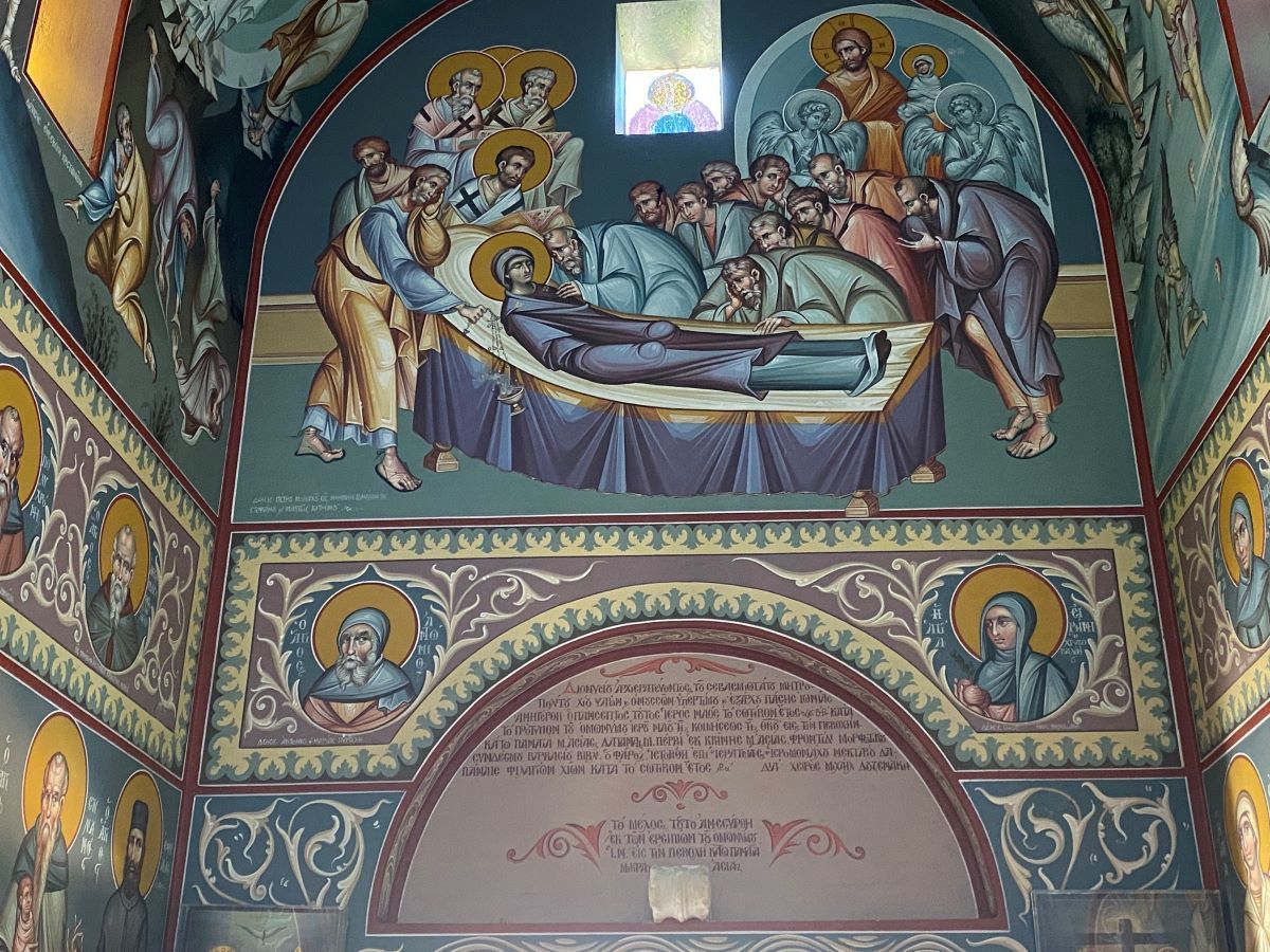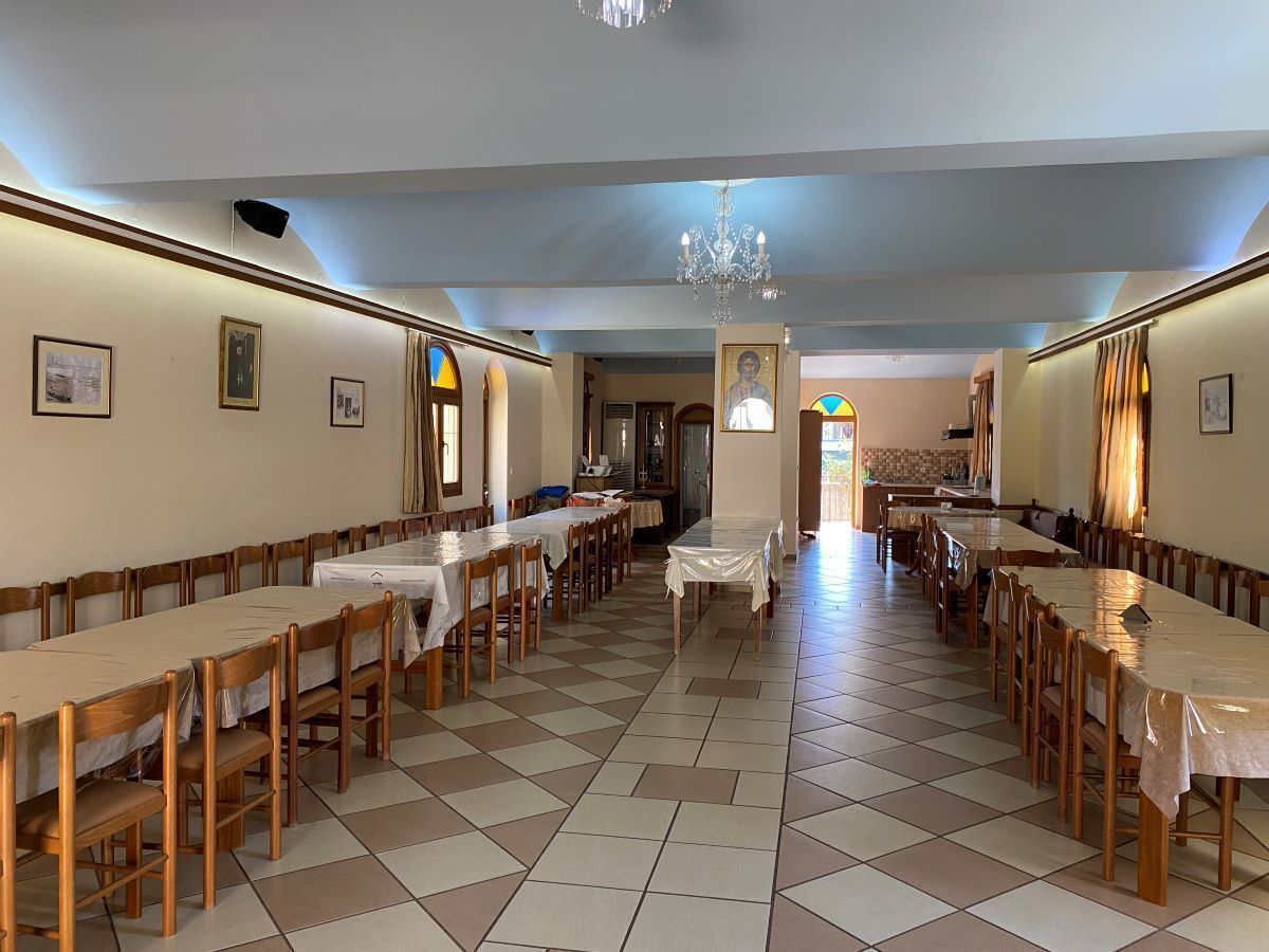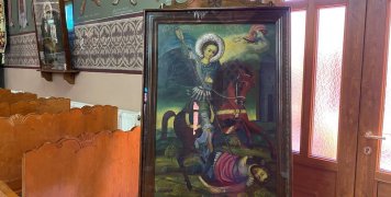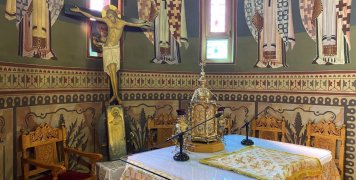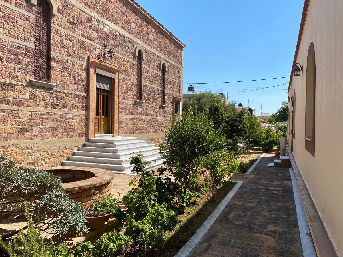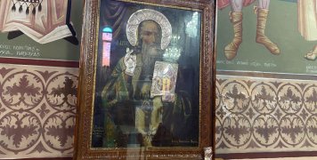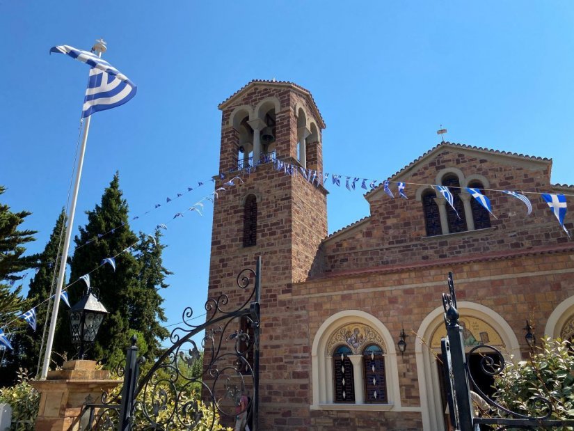 Μας υποδέχεται ο Ιερέας Νεκτάριος Επιτροπάκης, παιδί προσφύγων ο ίδιος, ιδιαίτερα προσιτός, σεβάσμιος και αρκετά κατατοπισμένος, σε μια Εκκλησιά, που μας προδιαθέτει για το ιδιαίτερο του χώρου, αφού από την μια μεριά της εισόδου της έχει την αναπαράσταση της μεταφοράς της εικόνας του Αγίου από τον Τσεσμέ στην Χίο και από την άλλη το δράμα της προσφυγιάς του 1922.