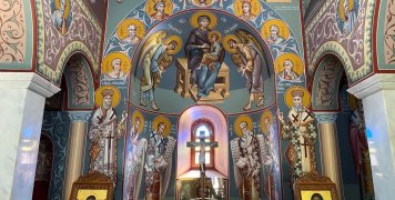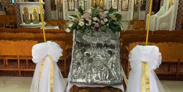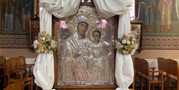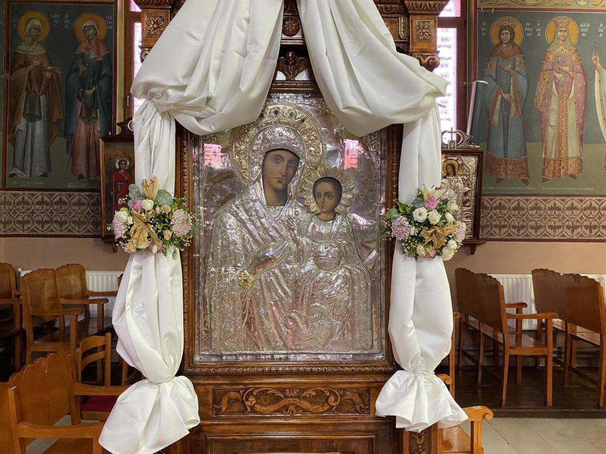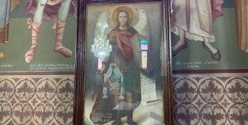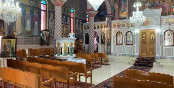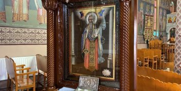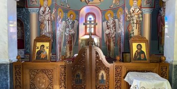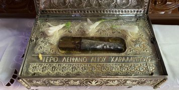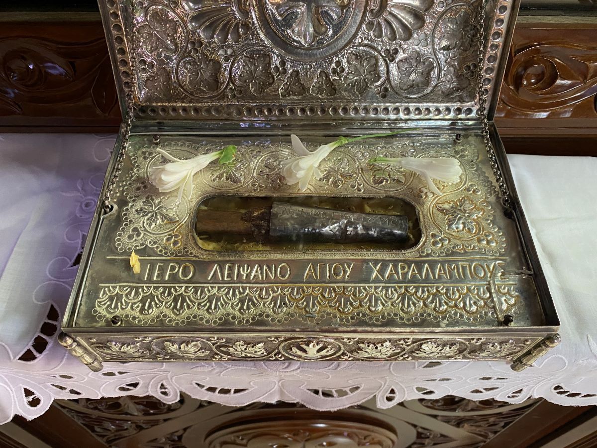 Ο πατέρας Νεκτάριος μας δίνει ιστορικά στοιχεία του Ναού, που εκτός της εικόνας του Αγίου Χαραλάμπους, έχει ακόμα εικόνες του Αγίου Δημητρίου από το Ρεϊς ντερέ, της Αγίας Φωτεινής του αδελφάτου των Σμυρναίων και του Ταξιάρχη από το κοιμητήριο του Τσεσμέ.