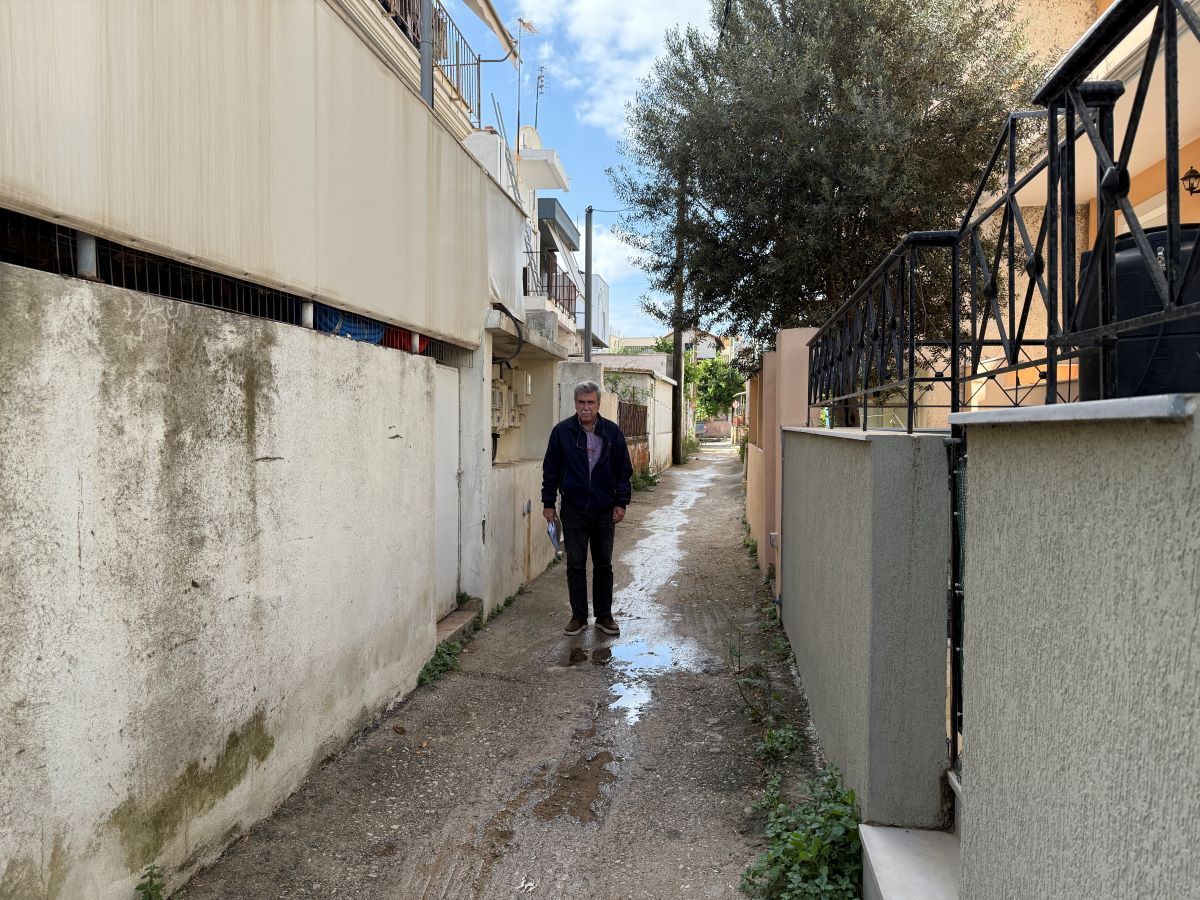 Απέναντι καλάμια, ένας άμπελος και ένα σπίτι σκεπασμένο με ένα πράσινο σκίαστρο, σε ένα δρόμο, που καταφανώς δεν έχει καμιά περιποίηση, κάτι που επισημαίνει και ο κάτοικος Κώστας Κλάπας.