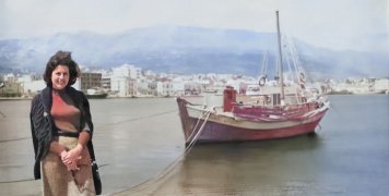Αριστερά μας μια πάροδος προς την Μίμη Χανδρή, μια αυλή με ένα τεράστιο φίκο και ένα πεύκο, ξύλινα σπιτάκια και στοιβαγμένη ξυλεία, αμπέλια και βοκαμβίλιες.