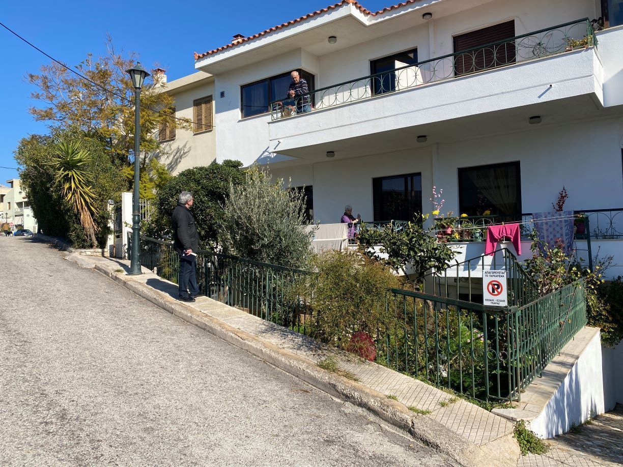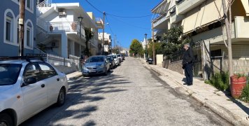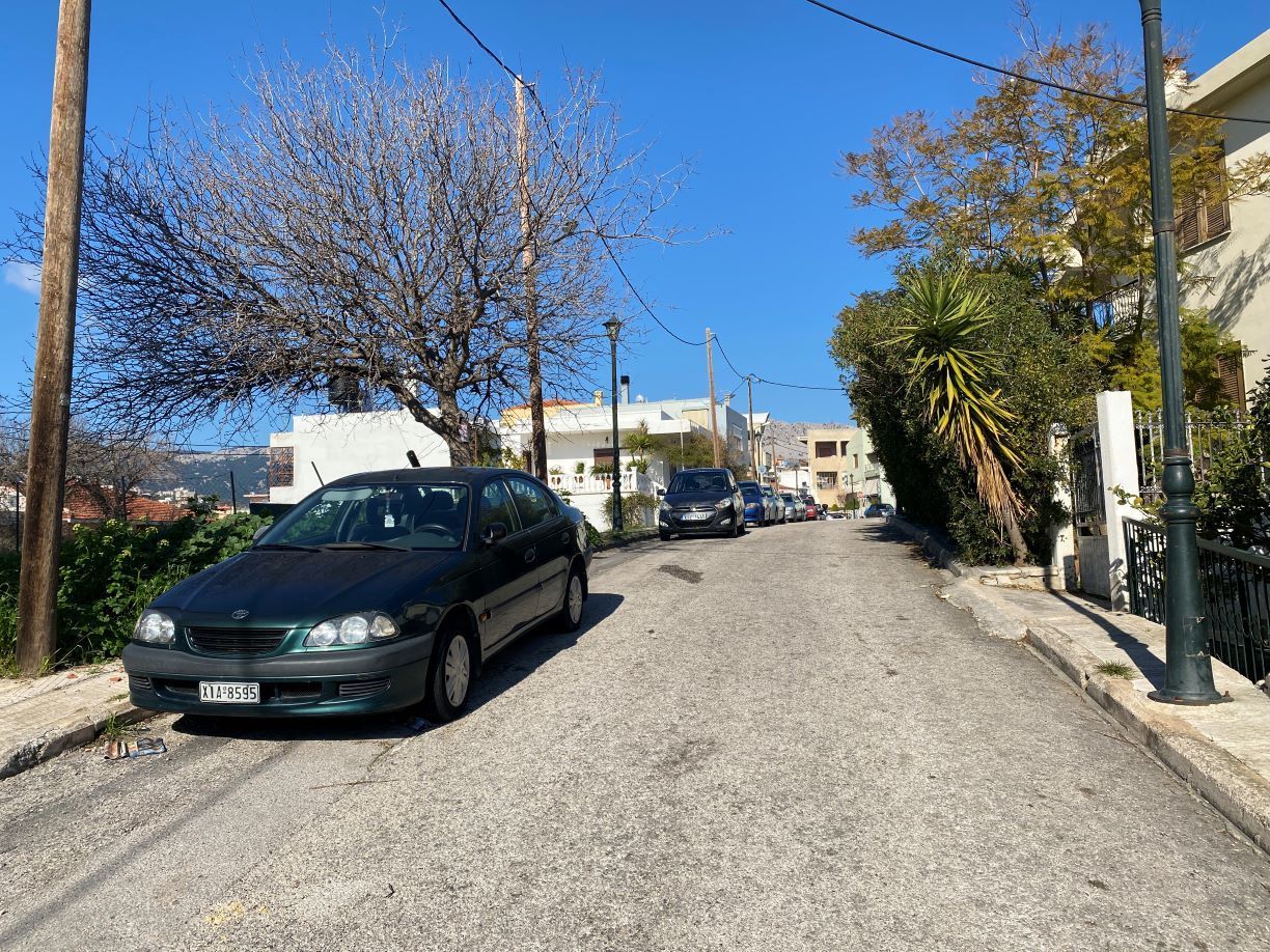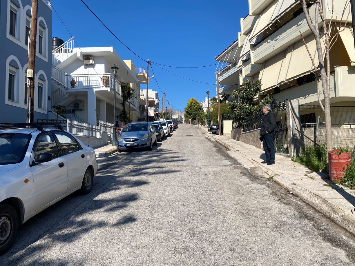 Θα την ακολουθήσουμε και εμείς ακριβώς σαν κάθοδο, παρατηρώντας ότι ξεκινάει από ένα μικρό παρτέρι, που στην ουσία περιβάλλει τους στύλους υψηλής τάσης της ΔΕΗ, απέναντι από ένα φράκτη με θάμνους, που… κρύβει το γωνιακό σπίτι, ενώ δεξιά και απέναντι υπάρχει ένα από τα δύο οικόπεδα της οδού, που έχουν γλυτώσει την πυκνή δόμηση, δείχνοντας πως ήταν η περιοχή προτού οικοδομηθεί.
