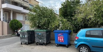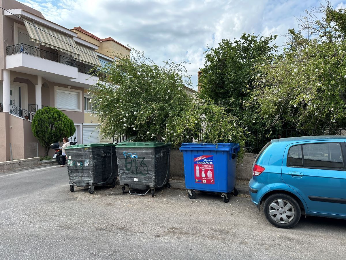 Από το δεξί μας χέρι ένα σπίτι με χαρακτηριστικά μεγάλα παράθυρα απέναντι από τους λίγους κάδους της πόλης, που πάνω τους έχουν… άνθη από παρακείμενα λουλούδια.