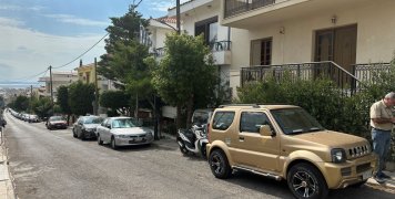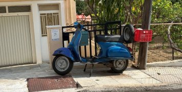 Η οδός επιτρέπει την στάθμευση εναλλάξ σε μονούς και ζυγούς μήνες, κάτι που αφορά κυρίως τα οχήματα και όχι ένα συμπαθή βεσπάκι, που ανταμώνουμε κάτω από ένα διώροφο με πρασινάδες.