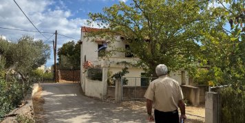 Για την συνέχεια μια οικία στο γκρί χρώμα και στην εξωτερική πέτρα και την πόρτα, απέναντι από τσικουδιές με θέα την πόλη της Χίου και την θάλασσα στο βάθος.