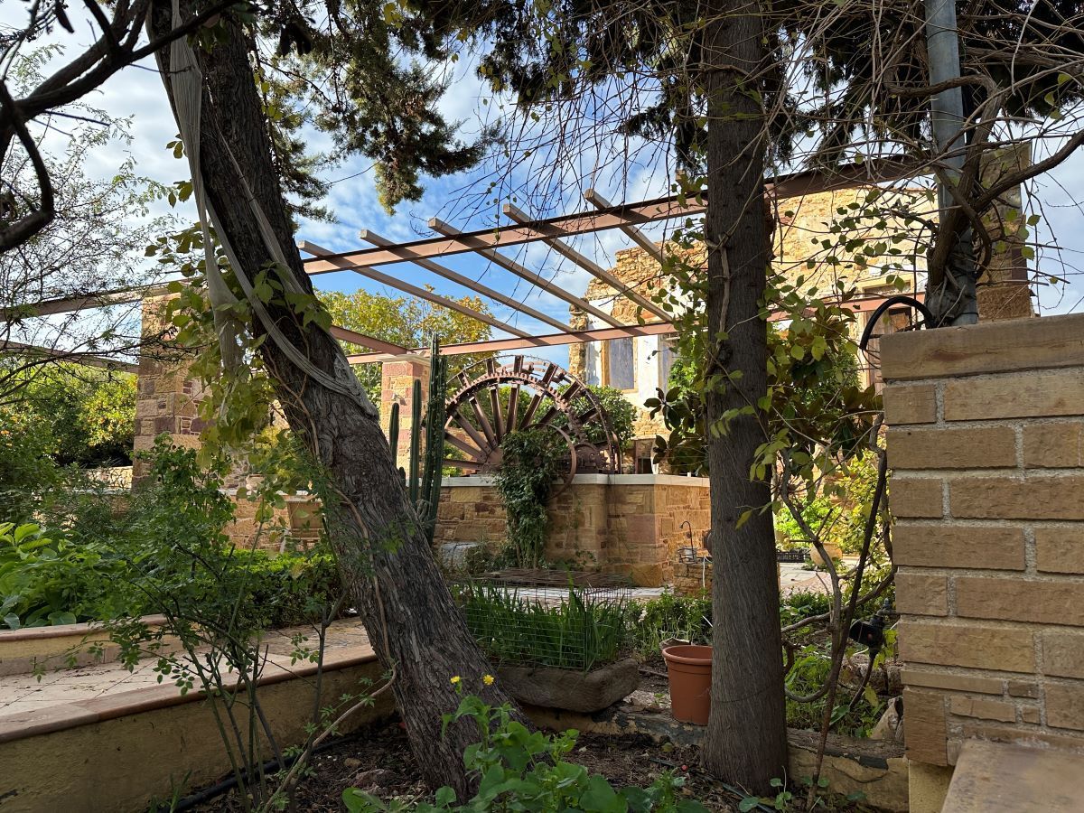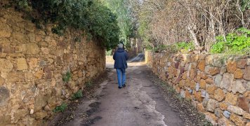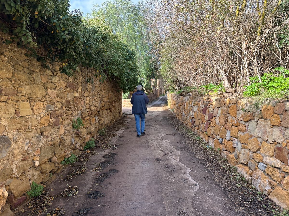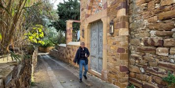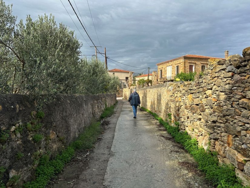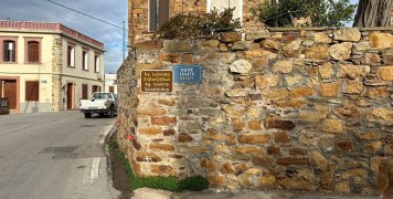 Πετροντούβαρα και κρεμαστοί κισσοί είναι η πρώτη εικόνα της οδού, ενώ αριστερά μας ξεπροβάλλει μια πετρόκτιστη νέα οικία, με περίτεχνη είσοδο και ένα μάγγανο στο βάθος, στην σκιά κυπαρισσιών και ενός πεύκου.