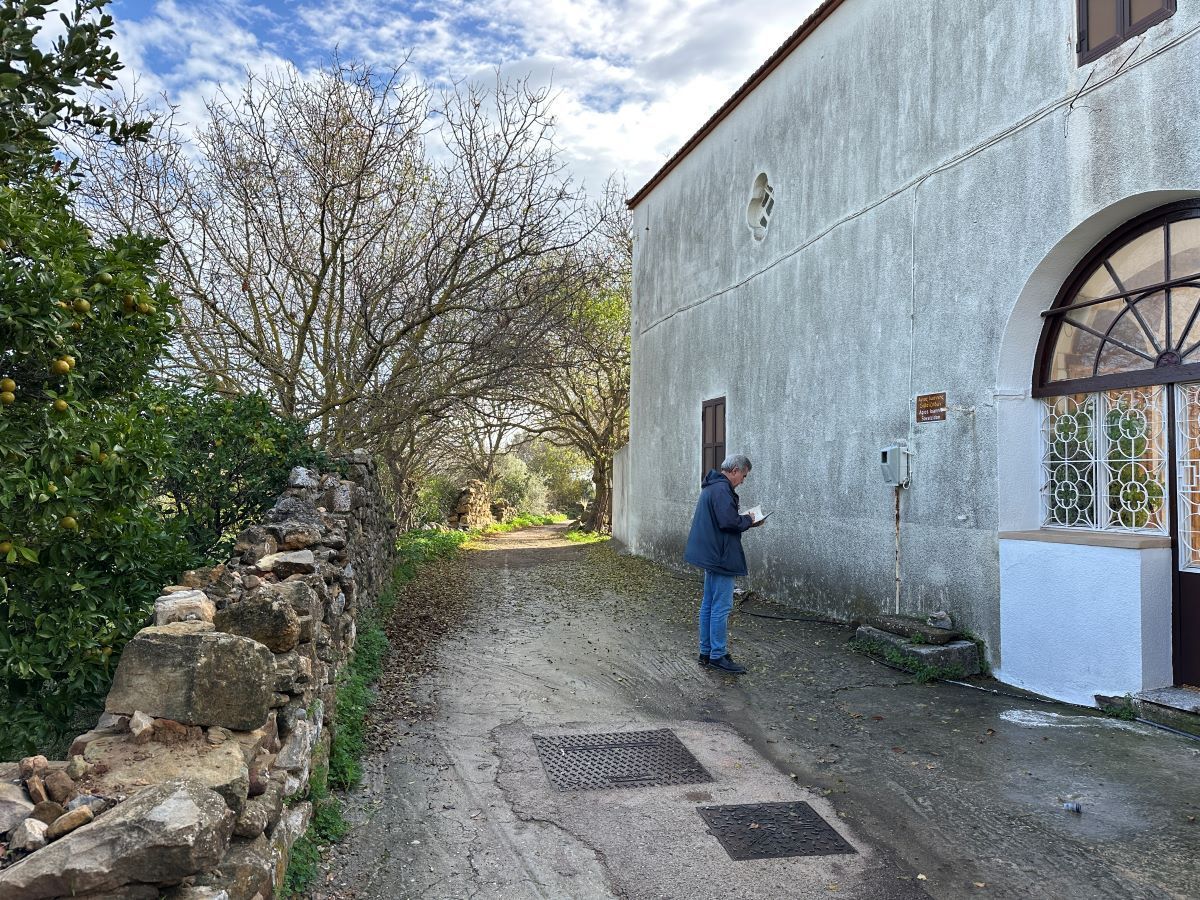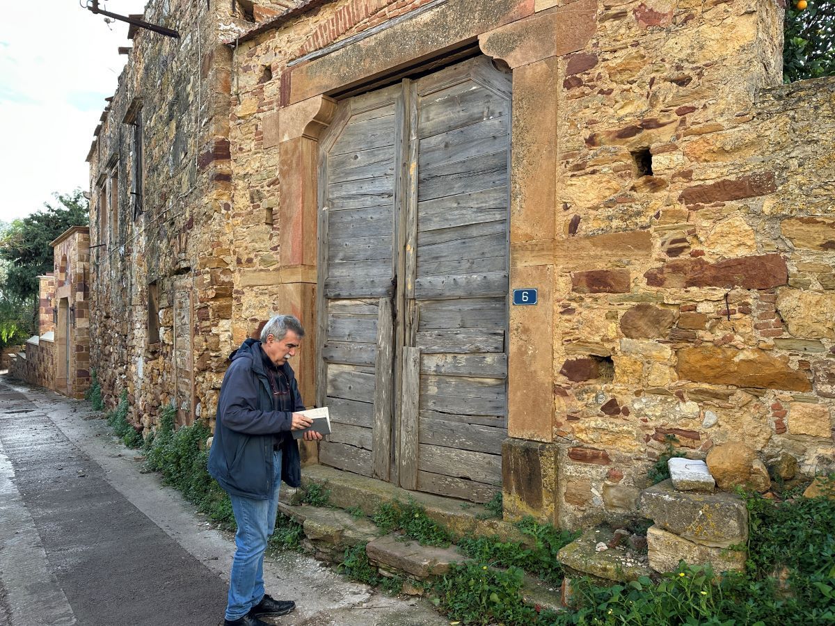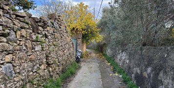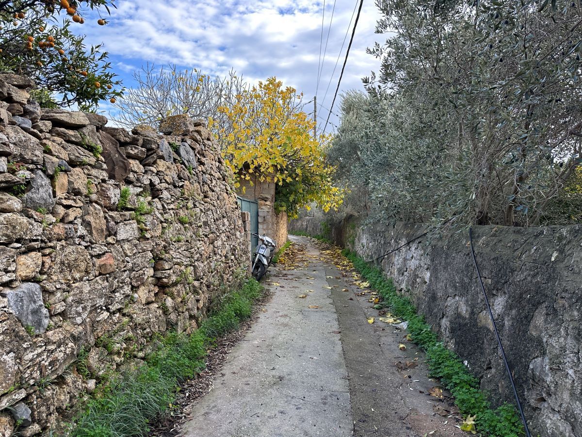 Στην έξοδο ένα παλιό παράθυρο, μια παρόμοια παλιά πόρτα, με σιδερένιο ρόπτρο και η οδός συνεχίζεται ανάμεσα σε πετροντούβαρα και μια νέα οικία δεξιά.