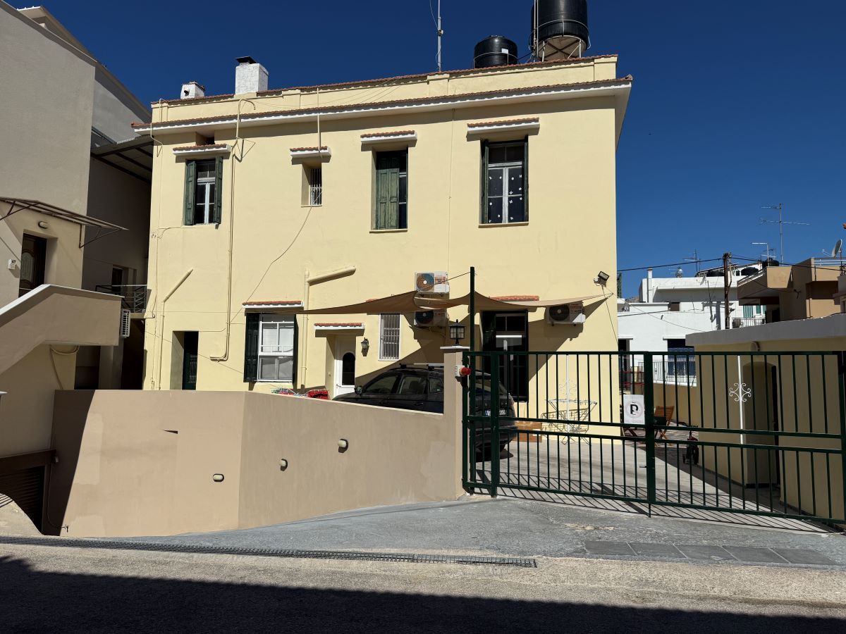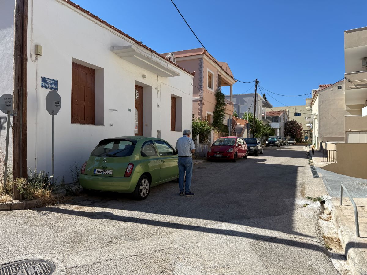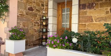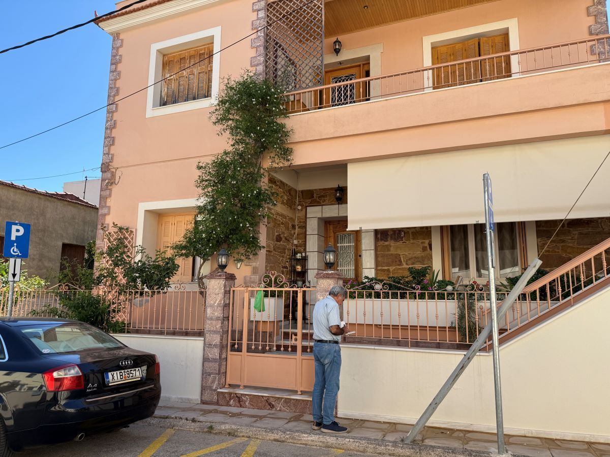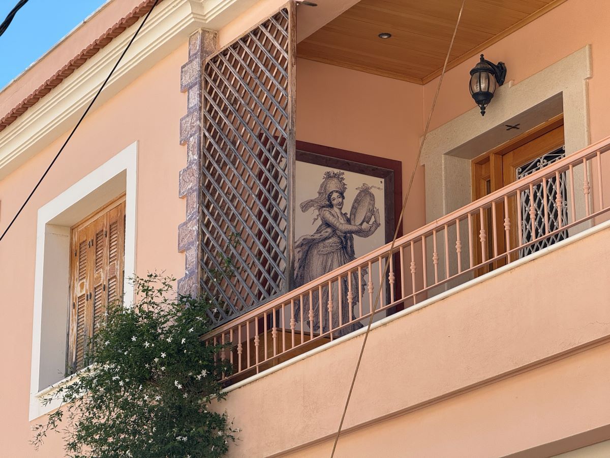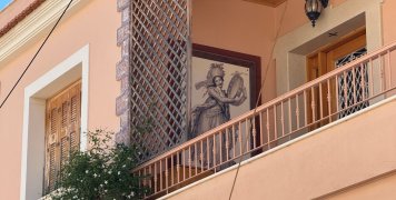 Απέναντι από το τριώροφο αυτό δια διπλοκατοικία κάτω με μια υπέροχη αυλή με γιασεμιά και πάνω με μια τοιχογραφία της «Χίας κόρης» στην είσοδο του 2ου ορόφου.