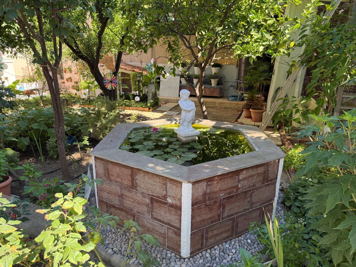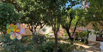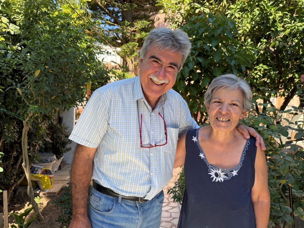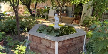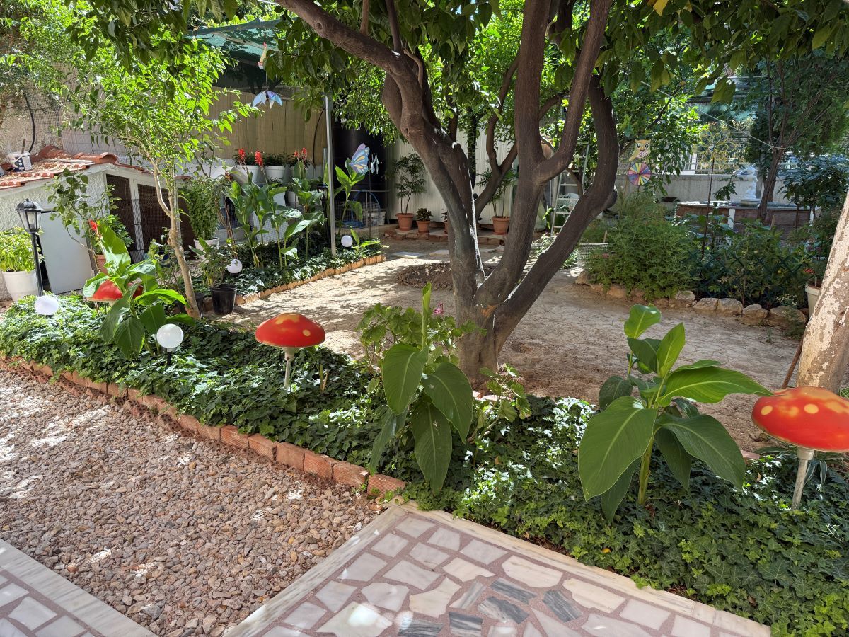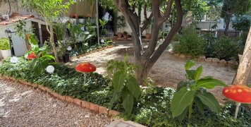 Κάτω η Μαρία Λιγνού μας ξεναγεί στον φροντισμένο κήπο της, «πνιγμένο» στα λουλούδια και τους κισσούς, ενώ φεύγοντας μας φιλεύει με διάφορα φυτά συν την γλάστρα τους για να είναι το δώρο ολοκληρωμένο.