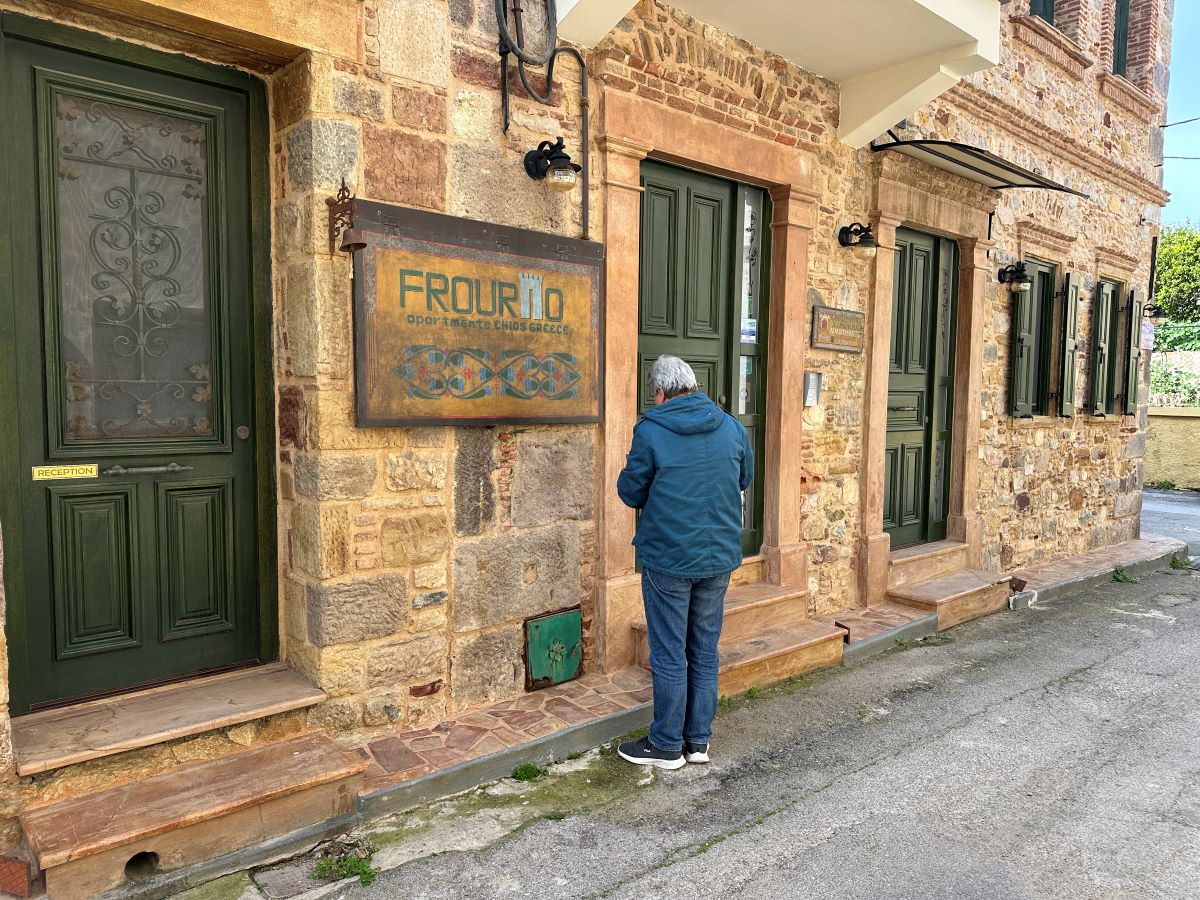 Ένα σπίτι με ημικύκλιο στην οροφή και 11 σκαλοπάτια να οδηγούν στην είσοδο του, μια συνάντηση με την οδό Ορθομένους, ένα από τα πολλά σπίτια στο Κάστρο που επισκευάζονται, ένα σπίτι με κισσούς στις εισόδους, ένα ωραίο διώροφο επισκευασμένο και εδώ υπάρχει συνάντηση με τον Κουλά, τον Πύργο, που αμφιβάλλομε αν ένας Χιώτης στους 100 γνωρίζει την ύπαρξη του.
