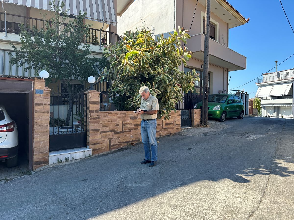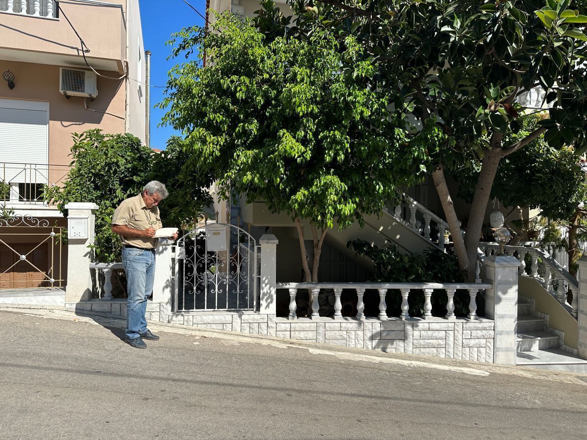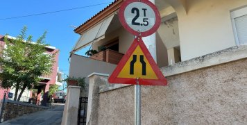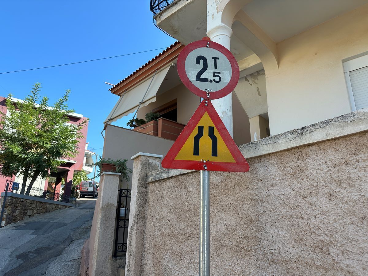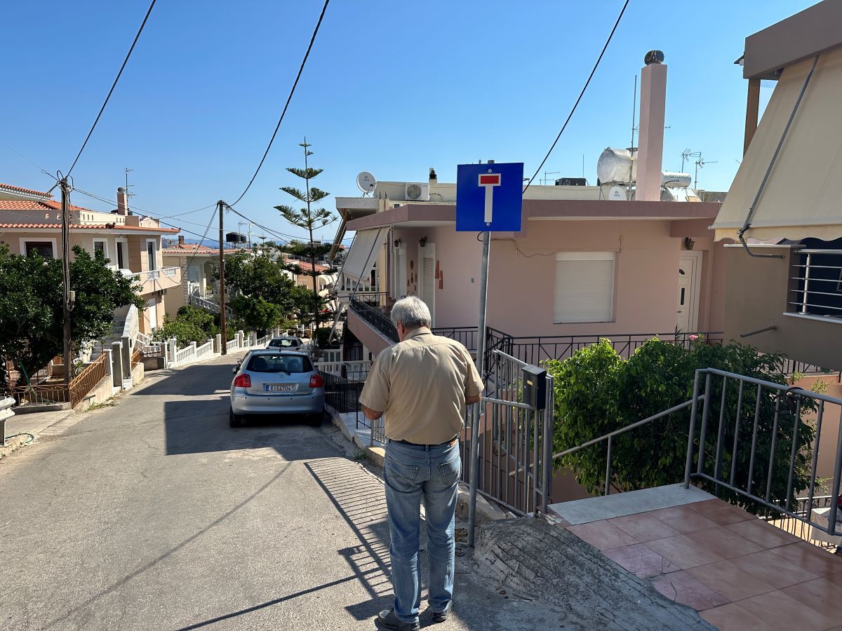 Μια οικία με στοιχεία ΣΜ 1994 πνιγμένη στο πράσινο, πολλοί χώροι στάθμευσης και άλλοι που λείπουν σε σημείο που… ενοικιάζονται, αυλές με πράσινο και τριανταφυλλιές και εδώ η οδός «πνίγεται» από δίκυκλα σταθμευμένα και στις δύο πλευρές ενώ κυριαρχούν οι πινακίδες για απαγόρευση στάθμευσης.
