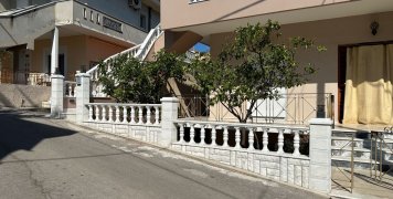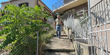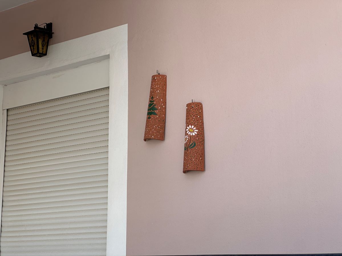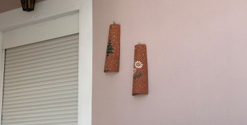 Πρασινάδες στις εισόδους σπιτιών, ένα με διακοσμητικά κεραμικά στην πρόσοψη, παιχνίδια με φυτά στο κόκκινο και το άσπρο και δυό οικίες με όμοια διακοσμητικά μαρμάρινα κολωνάκια στο χρώμα του άσπρου και του γκρί.