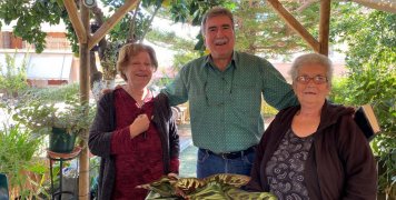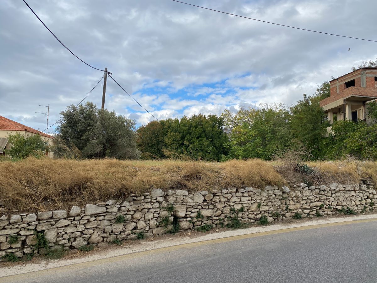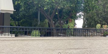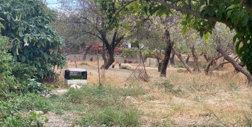 Αριστερά μας ένα μεγάλο χωράφι και απέναντι ένα σπίτι με κακτοειδή κρεμασμένα σε ένα εσπεριδοειδές με ένα φύλακα άσπρου χρώματος στην ταράτσα του.