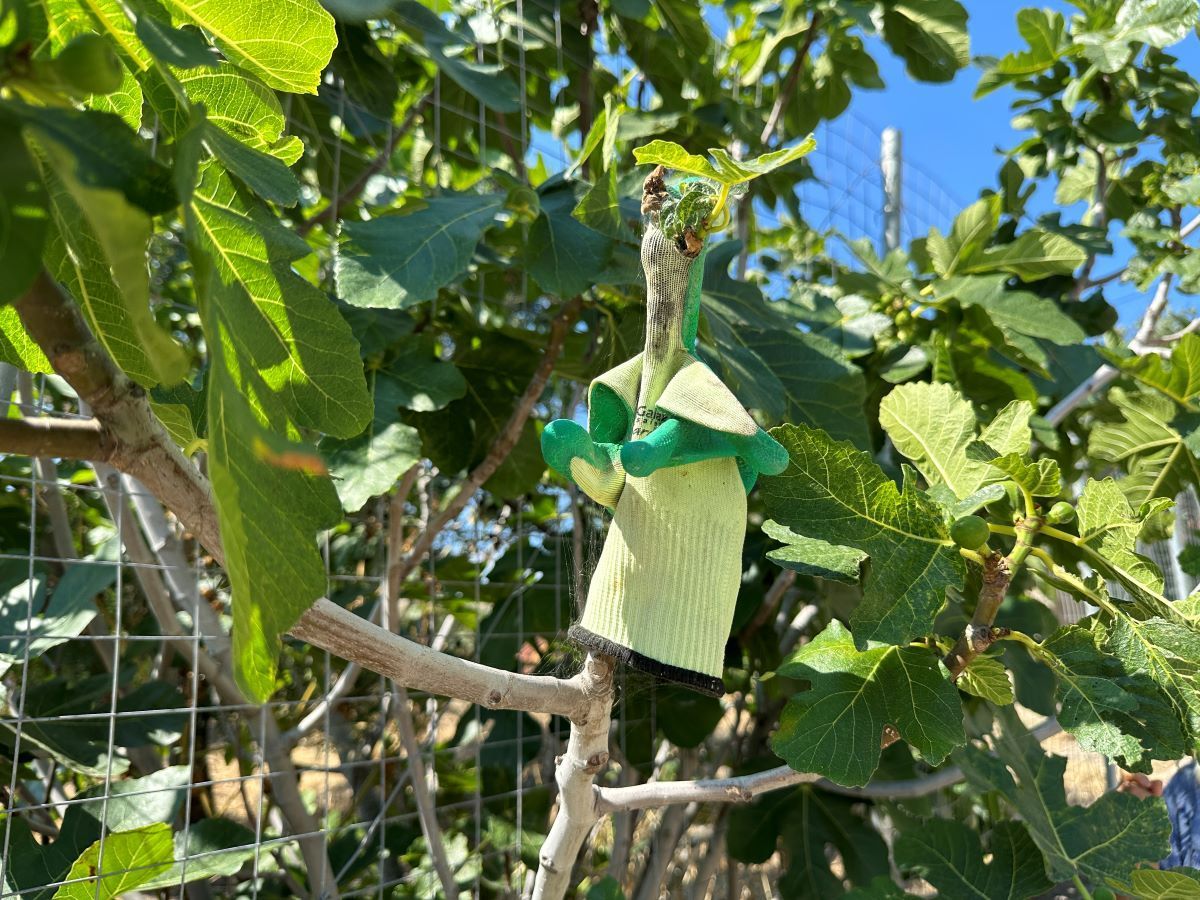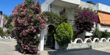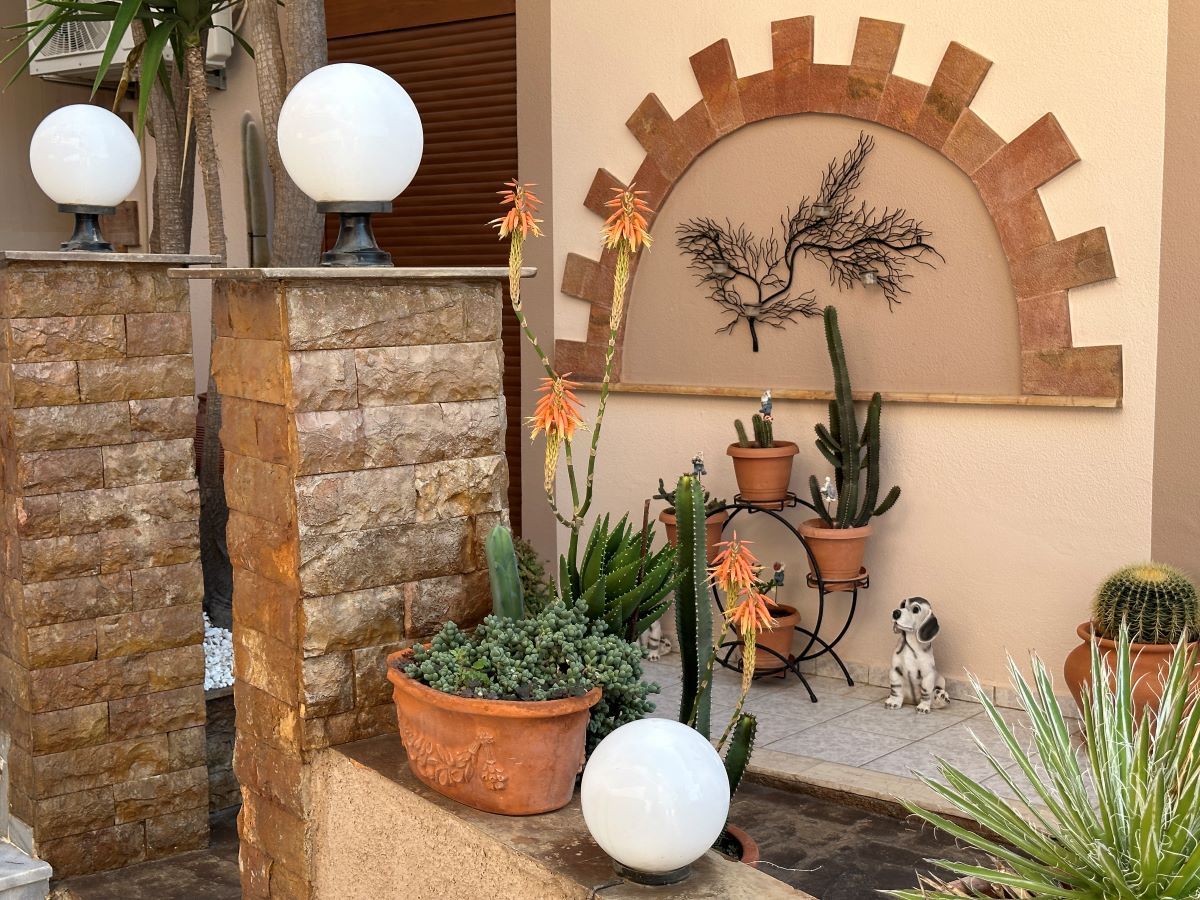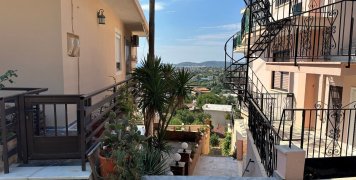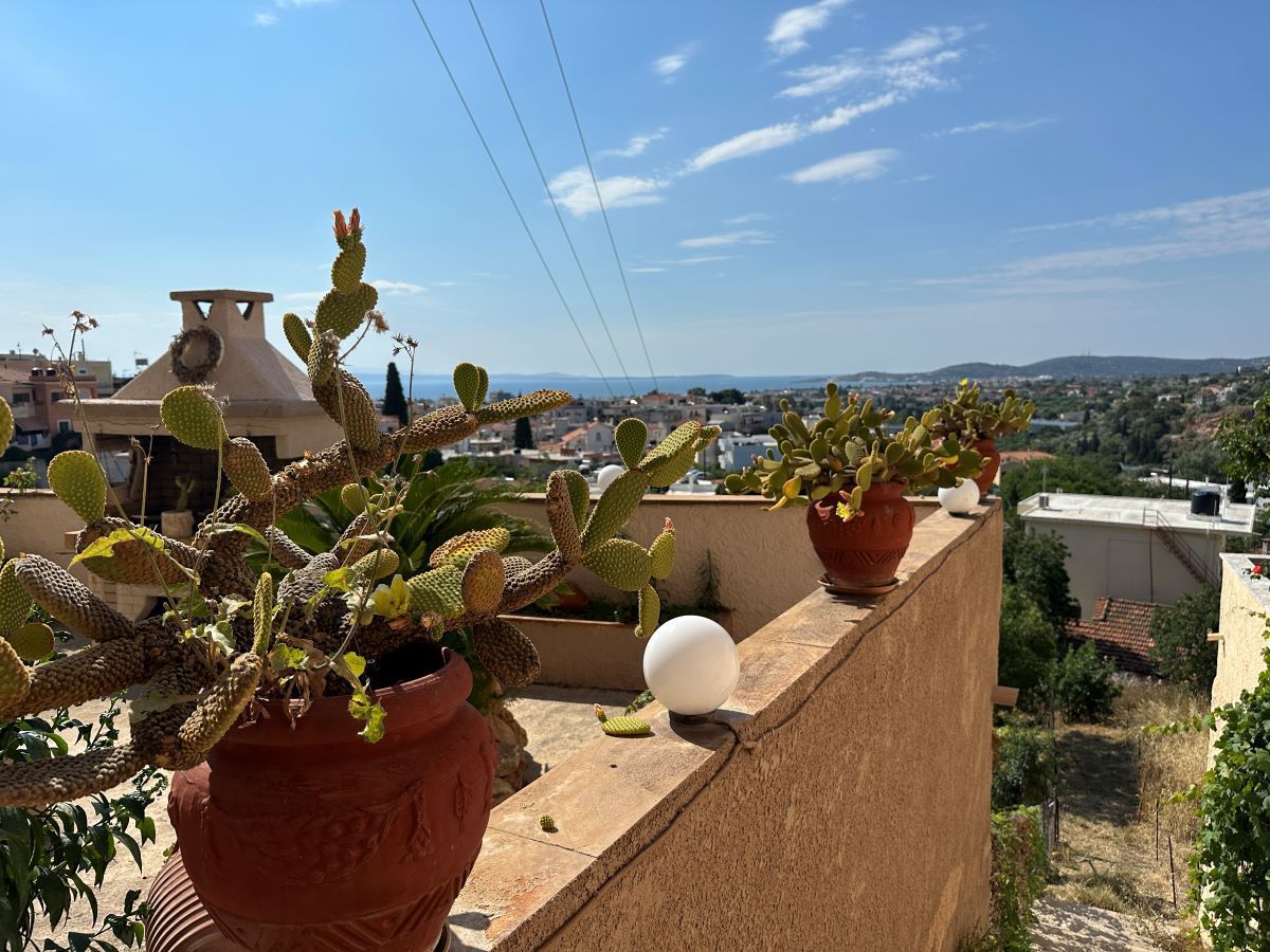 Μια συκιά από το αριστερό μας χέρι, βοκαμβίλιες, ένας υπέροχος κήπος και στο βάθος η θάλασσα από την μια πλευρά και ο λόφος του Αγίου Παντελεήμονα από την άλλη.
