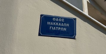 Από την οδό Αγίου Γιώργη Ορφανού στρίβουμε Νότια, σε ένα διώροφο σπίτι με πυλωτή, βρίσκοντας υπό την σκέπη ενός μικρόσωμου φύλακα την πρώτη πινακίδα της οδού Μακάδων Γιατρών.