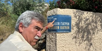 Στο σημείο αυτό συναντάμε το σπίτι με τον οβάλ φράκτη, απέναντι από την τελευταία πινακίδα της Μακάδων γιατρών πριν οδηγηθούμε στο τέλος της, αφού από την οδό Αγίου Γιώργη Ορφανού ξεκινήσαμε την περιήγηση μας σ’ αυτή και με μια γνώριμη μας από άλλη εκπομπή την Ειρήνη Τέττερη στην οδό Αγίου Σπυρίδωνος «Φτου και βγήκαμε».